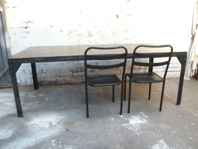 The Industrie dining table is a rugged industrial dining table. Large wooden planks form the top and are seated in a heavy steel frame. Contemporary lines with rustic charm.