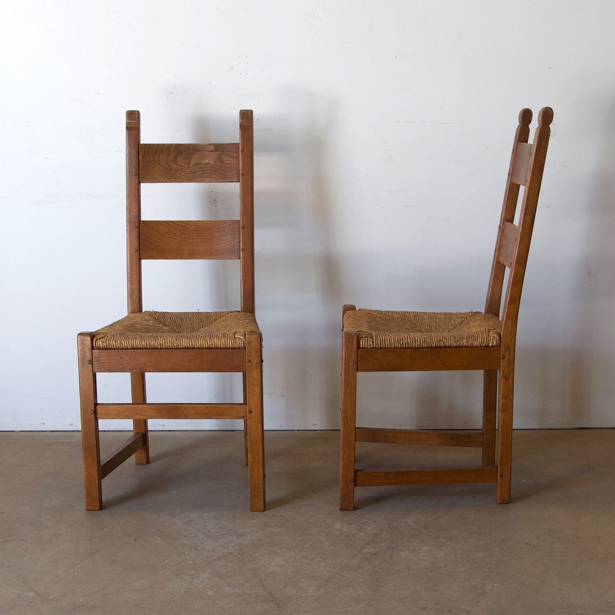 A set of six, European, dining chairs in the Brutalist style. Dating from the 1950's, these stylish chairs are in superb condition - crafted from solid oak with rush seats. A beautiful, practical set of rustic dining chairs with a very modern aesthetic. Priced as a set.