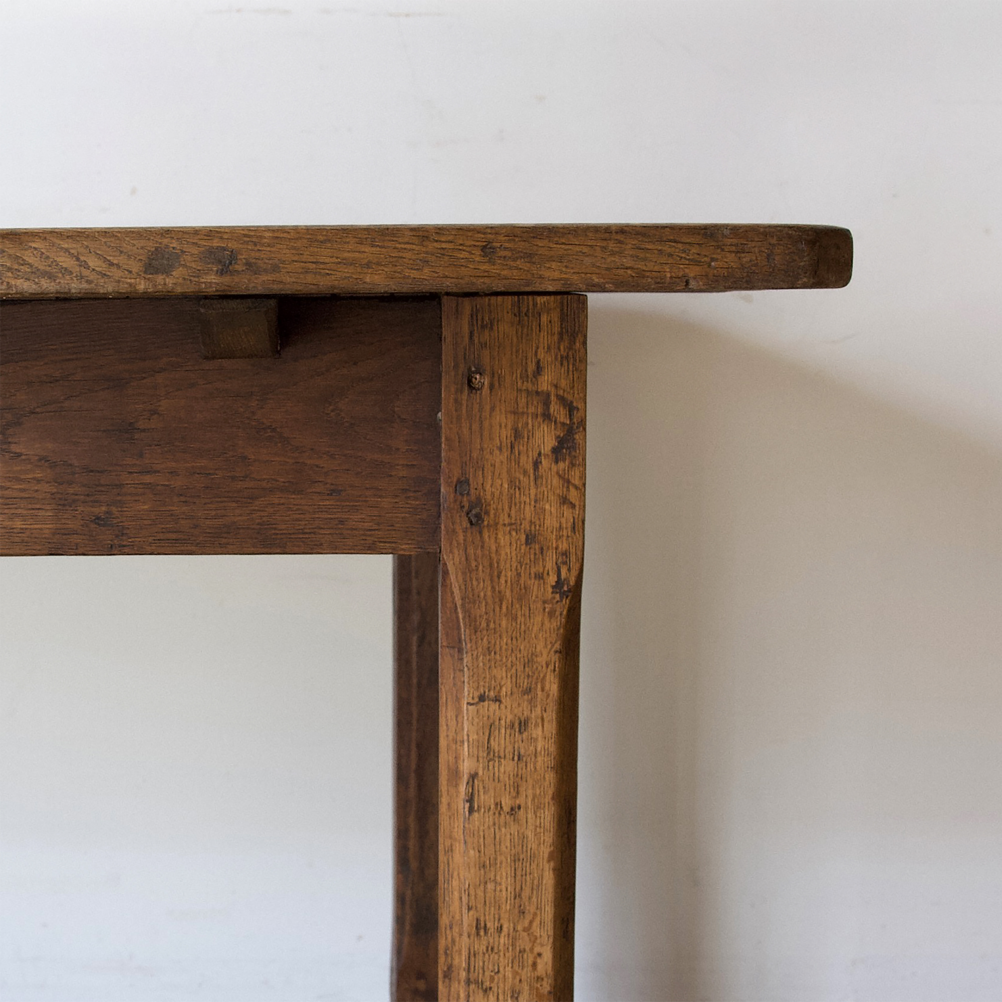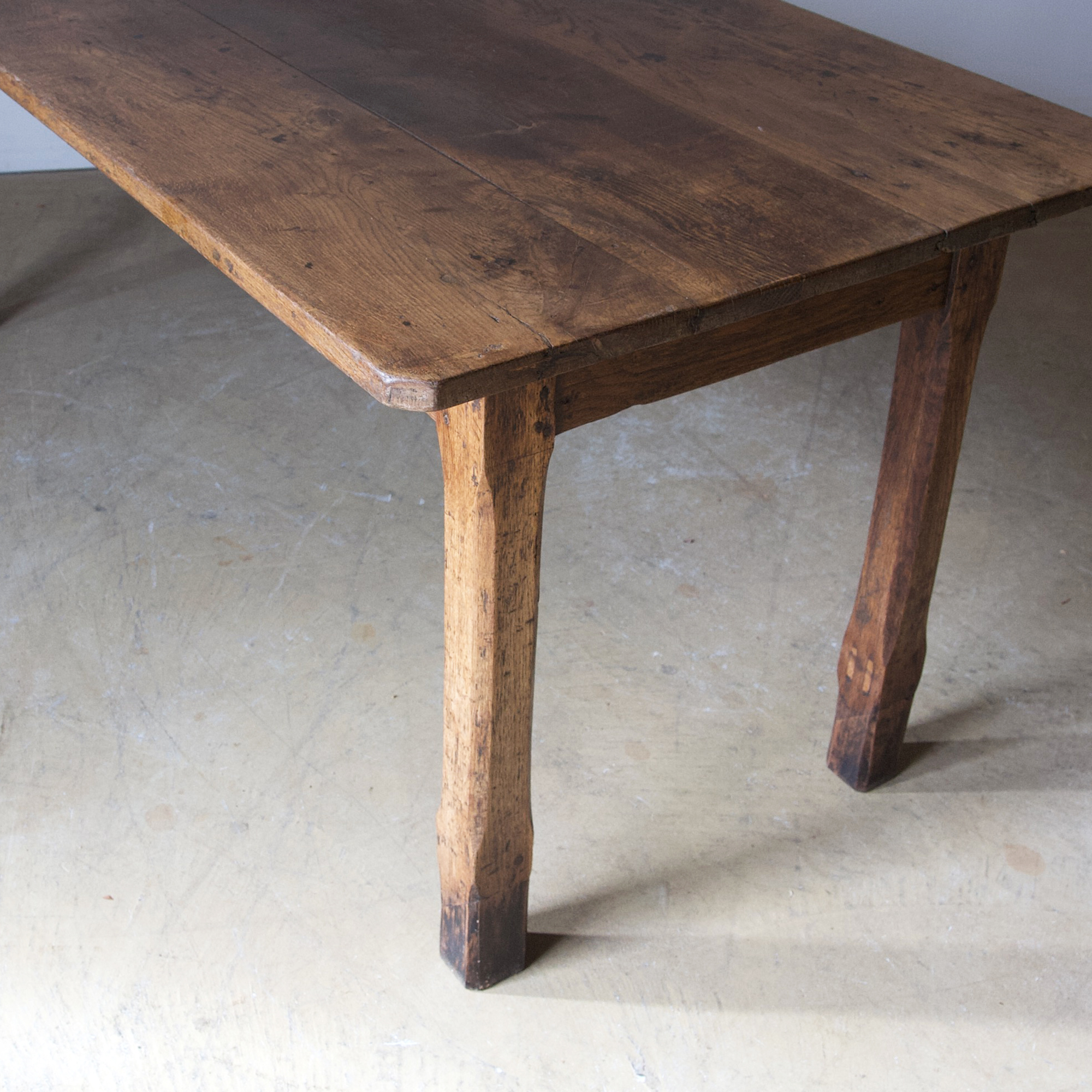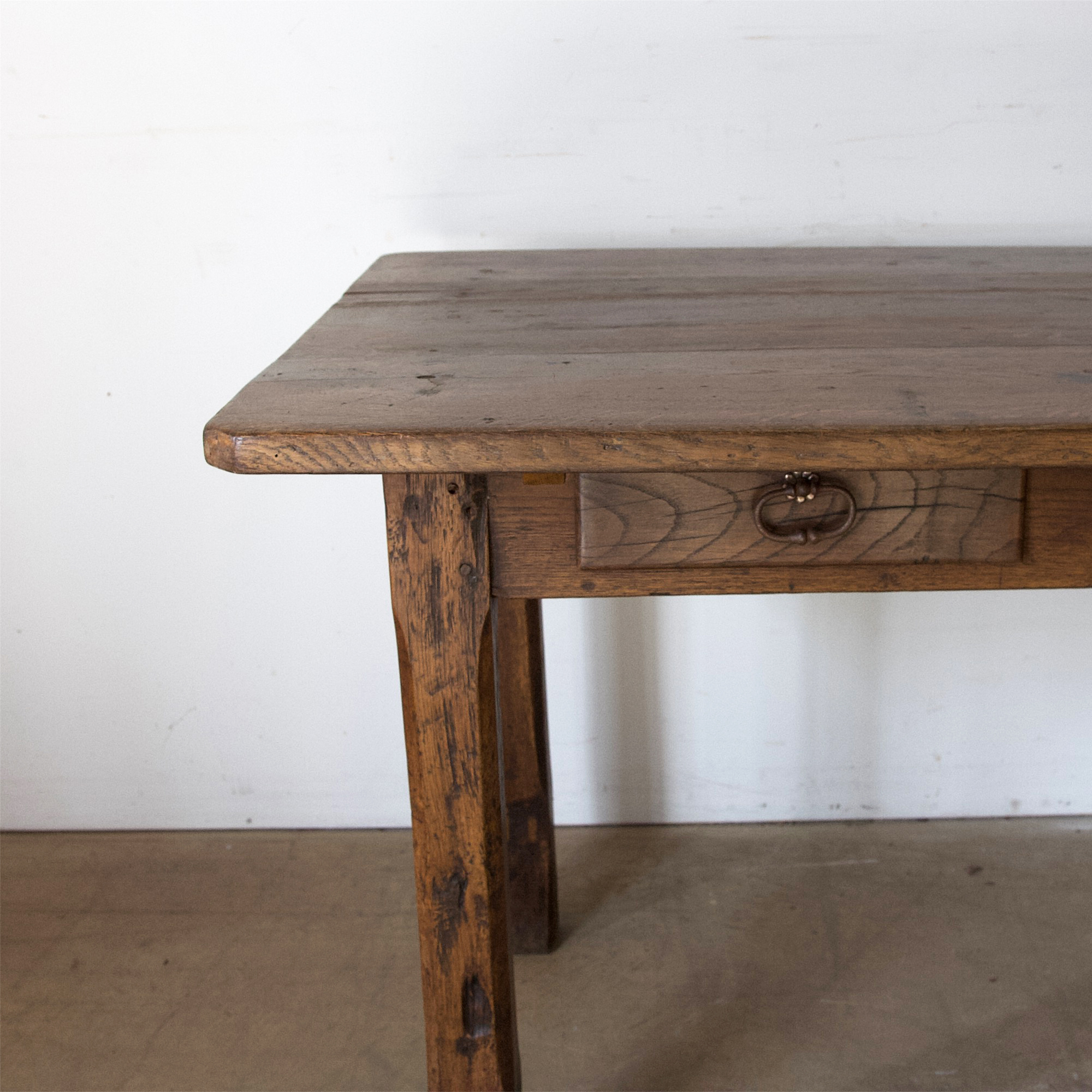 A delightful, French, 19th century, rustic farmhouse table with two drawers. This beautiful table is crafted from chestnut and oak and has a wonderfully rich, time worn patina. A wonderful characterful and practical dining table for a modern home.