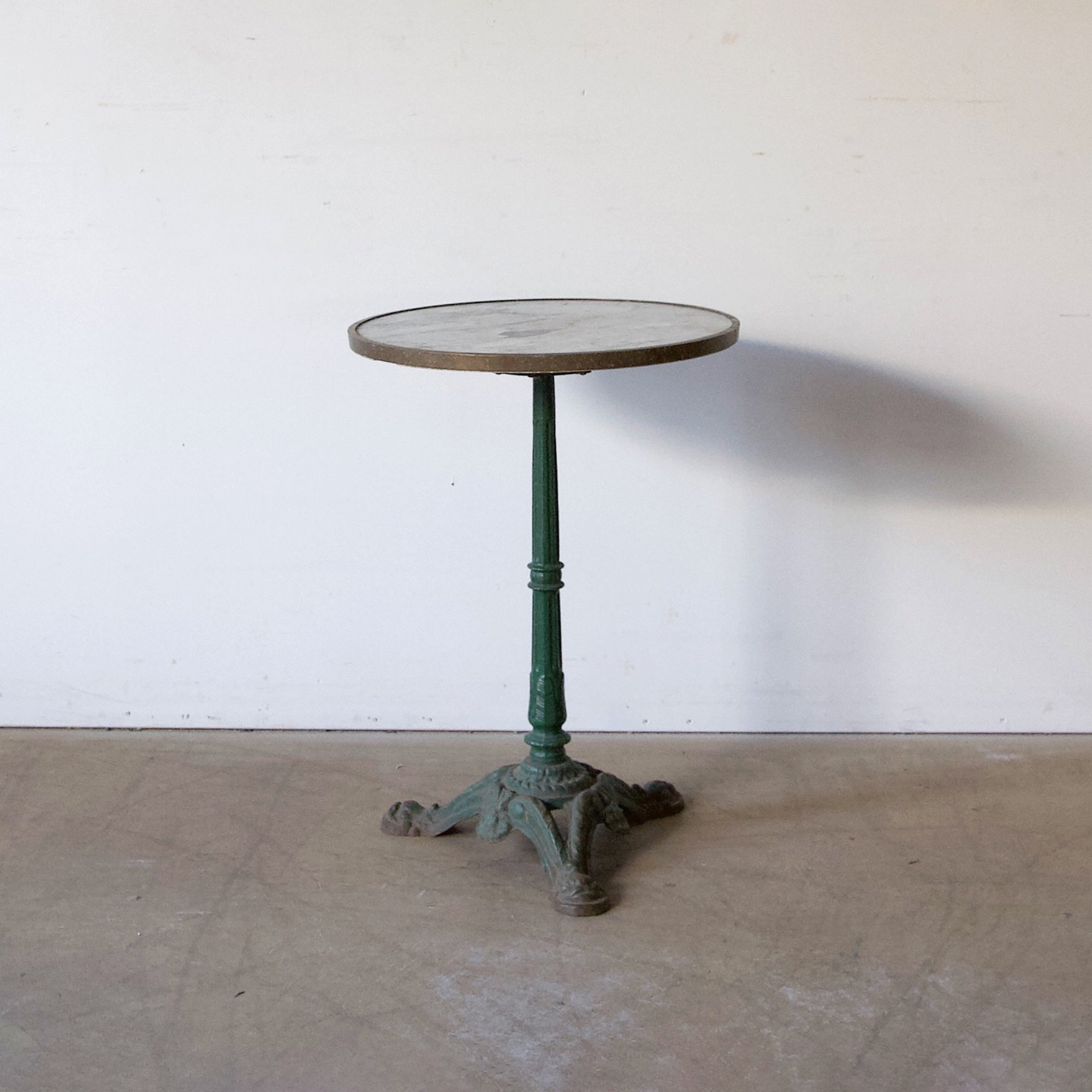 A beautiful, early 20th century, French wrought iron bistro table with original marble top. Brass banding around the marble and dolphin detail on the feet - original green painted finish. A charming table in superb condition - perfect for your morning coffee, to use as a side or lamp table or a lovely addition to a bathroom.