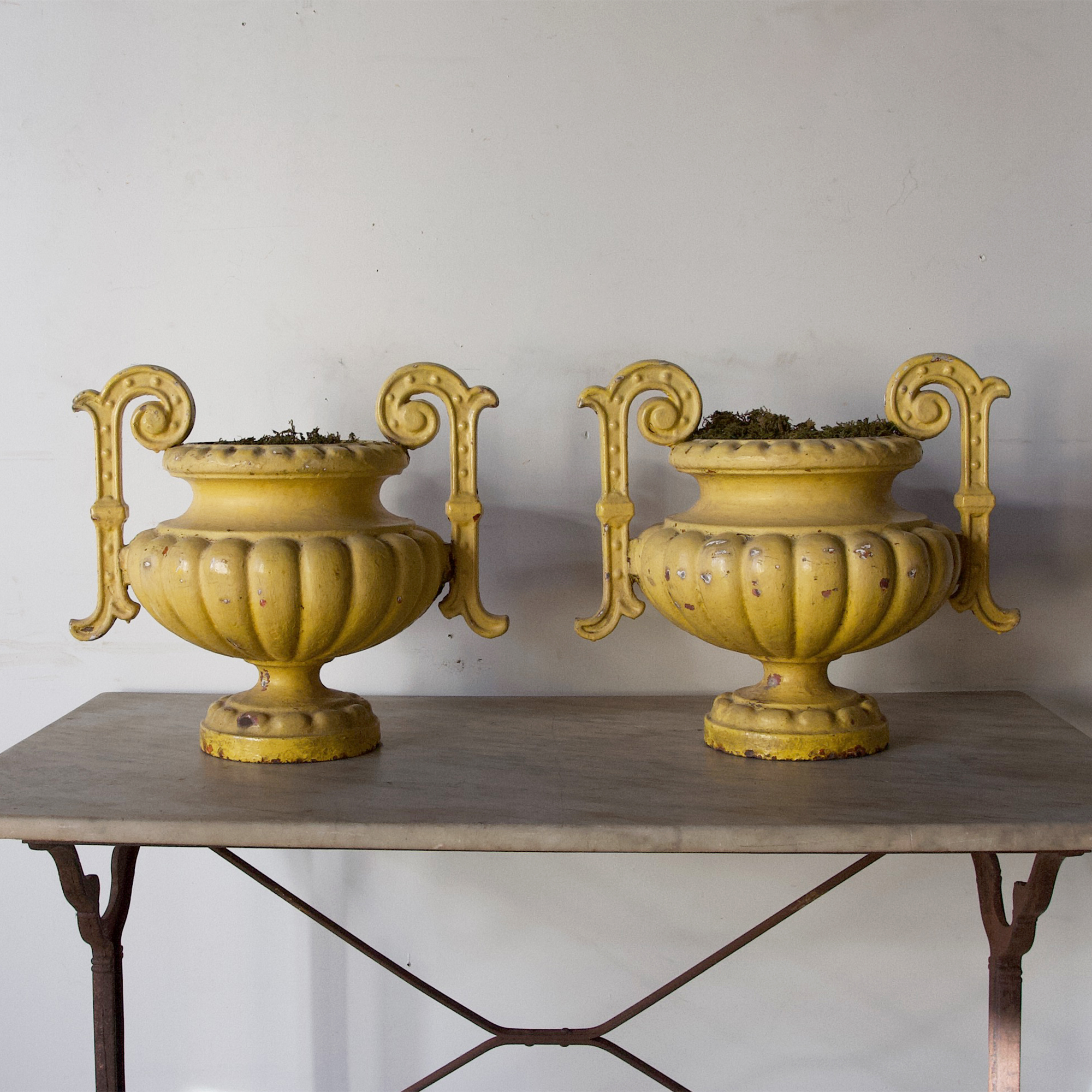 A beautiful pair of French, 19th century cast iron urns with a fabulous, original, sunflower yellow painted finish. A wonderful splash of colour for indoors or outdoors. Priced as a pair but could be sold singly.
