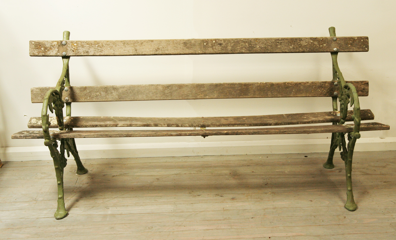 A very pretty early 20th century garden bench. The heavy wrought iron ends depict scrolled leaves and vines, the wooden slats are aged but still in good condition with lichen adding decorative appeal ! This charming bench would add a lyrical touch to any garden setting.