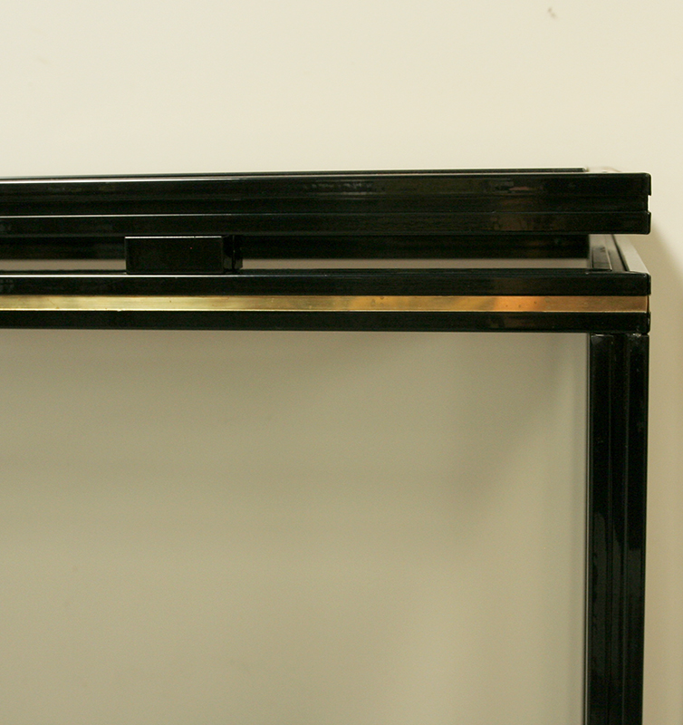 A very smart 20th century, Pierre Vandel console table. Black with brass detailing and smoked black glass top. A touch of Parisian chic for a discerning interior.
