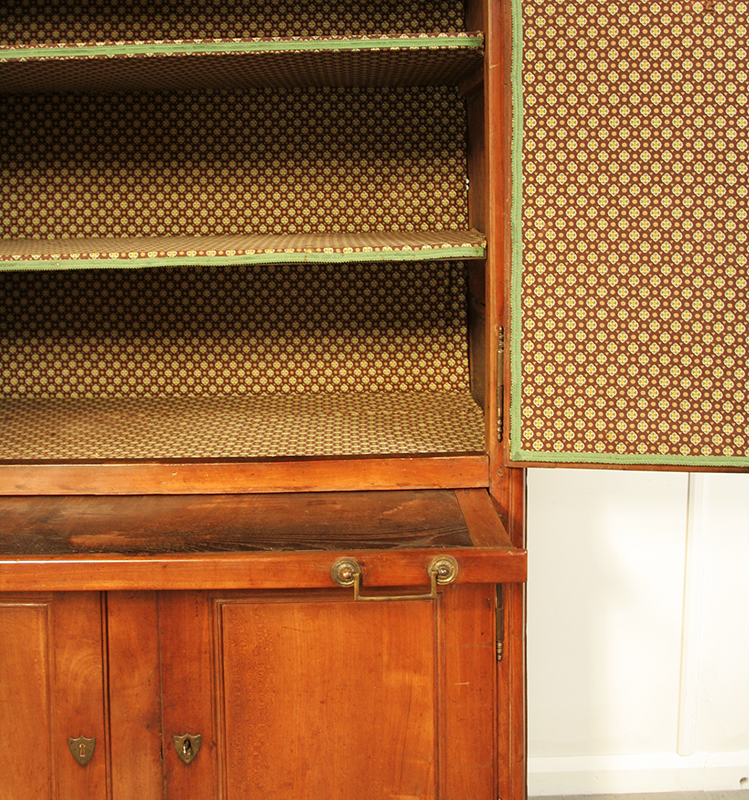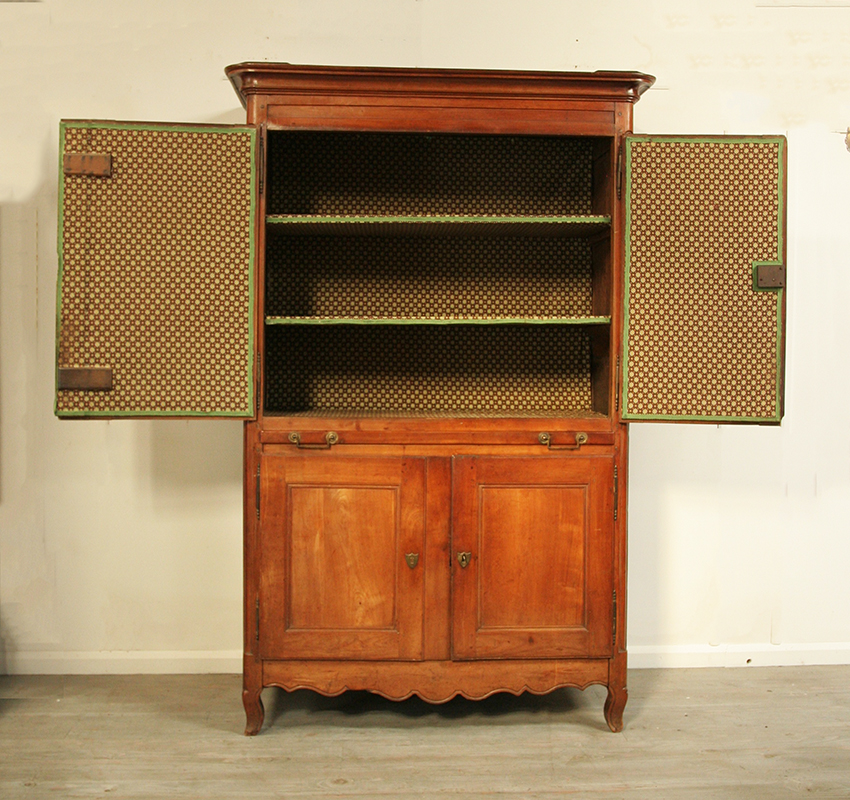 We stumbled across this beautiful cherrywood buffet deux corps in a shady corner of Aix En Provence. It dates from the late 18th century , directoire period , circa 1795. This charming cupboard has been lovingly lined many years ago with a pretty soleilado style fabric - a quintessentially Provençale, decorative and authentic touch. This gorgeous cupboard would be a fabulous feature piece for a modern rustic home.