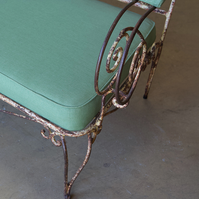 An exceptional and decorative, wrought iron garden settee dating from the 1940's. This wonderful settee is in great condition with newly upholstered seat and back. A stylish and whimsical piece - the perfect decorative accent to any covered outdoor space.