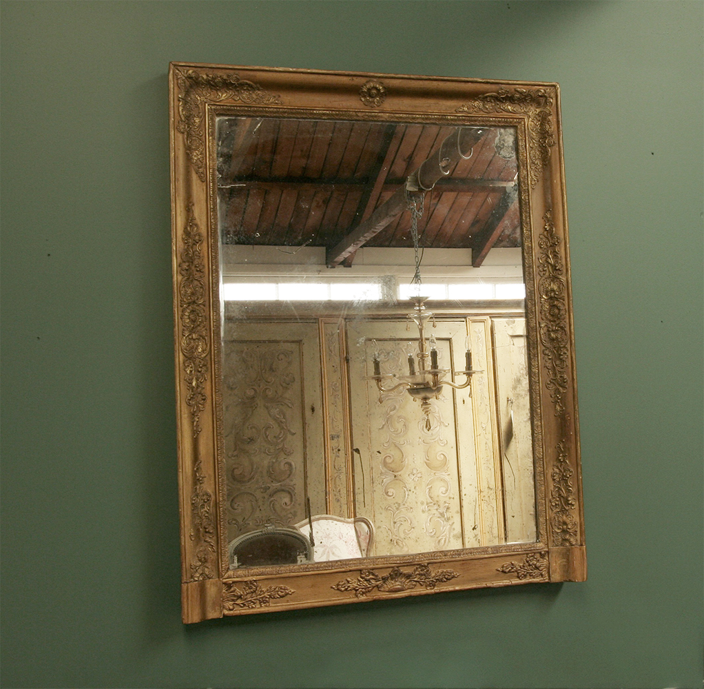 A late Empire period gilt mirror with original glass, circa 1840. This lovely mirror exudes the faded glamour of the Empire period - classical dimensions and decoration. The mirror is in orighinal condition apart from the bottom panel which has been restored at a later date.