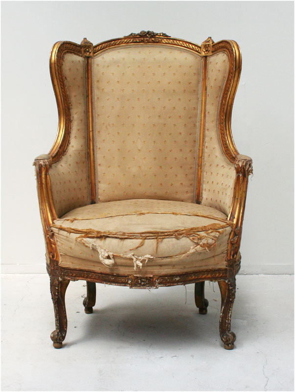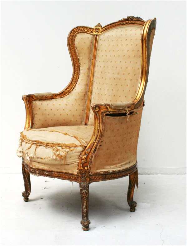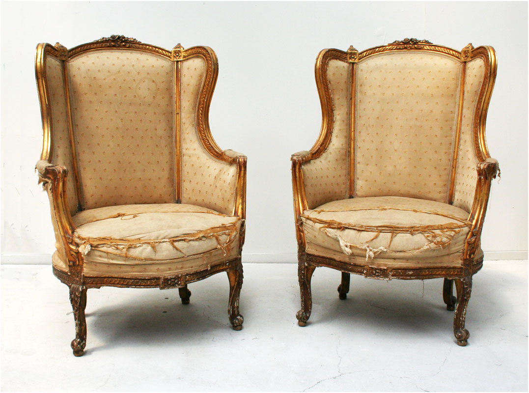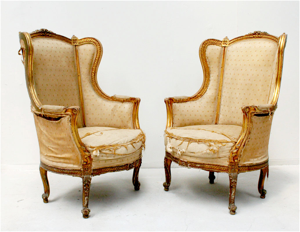 This exceptional pair of gilt bergères date from the second empire circa 1870. They belong to the resurgence of interest at that time in the furniture styles of earlier centuries. This charming pair of chairs are a high quality 19th century rendition of the 18th century transitional period. The flamboyant rococo style of Louis XV was replaced later in the 18th century by the straighter more classical lines of Louis XVI as interest in the classical lines of ancient antiquity thrived. These particular chairs document the transition between the two styles . As the florid lines of Louis XV segued into the stricter lines of Louis XVI the transitional style adopted elements of both. These chairs exhibit the serpentine lines of Louis XV in the shape of their legs and arms yet the the straight lines of the backs , the carved grecian frieze - like decoration and the square carved lozenges are all pure Louis XVI. The chairs are excellently crafted and of the highest quality. The chairs are presented "dans leurs jus ", in original condition awaiting carefully chosen reupholstery or for the purist, to be enjoyed as they were found , gloriously and incredibly untouched by the modern world.