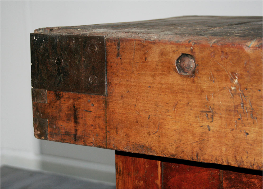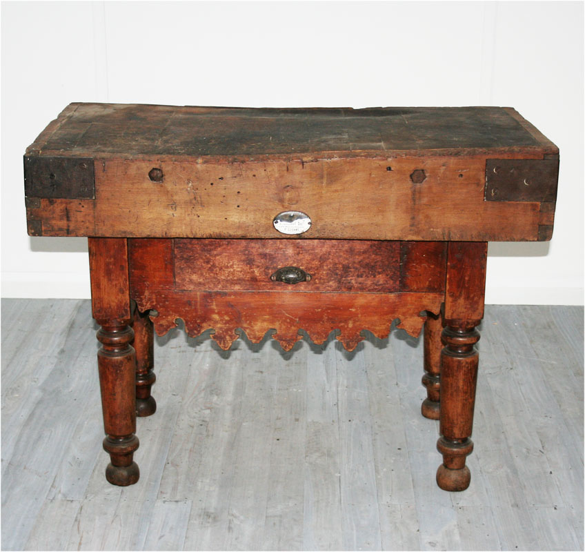 A delightful 19th Century butcher's block from St Etienne , near Lyon , France . This lovely old butcher's block has a rich, time worn patina and the original enamelled maker's plaque still in place. The block has a traditional shaped skirt typical of the earlier blocks and a beautifully decorative detail. The drawer has been replaced but the end grain chopping block and base are both original.