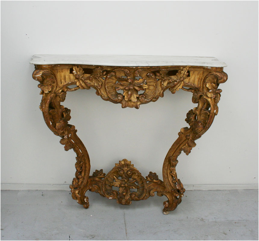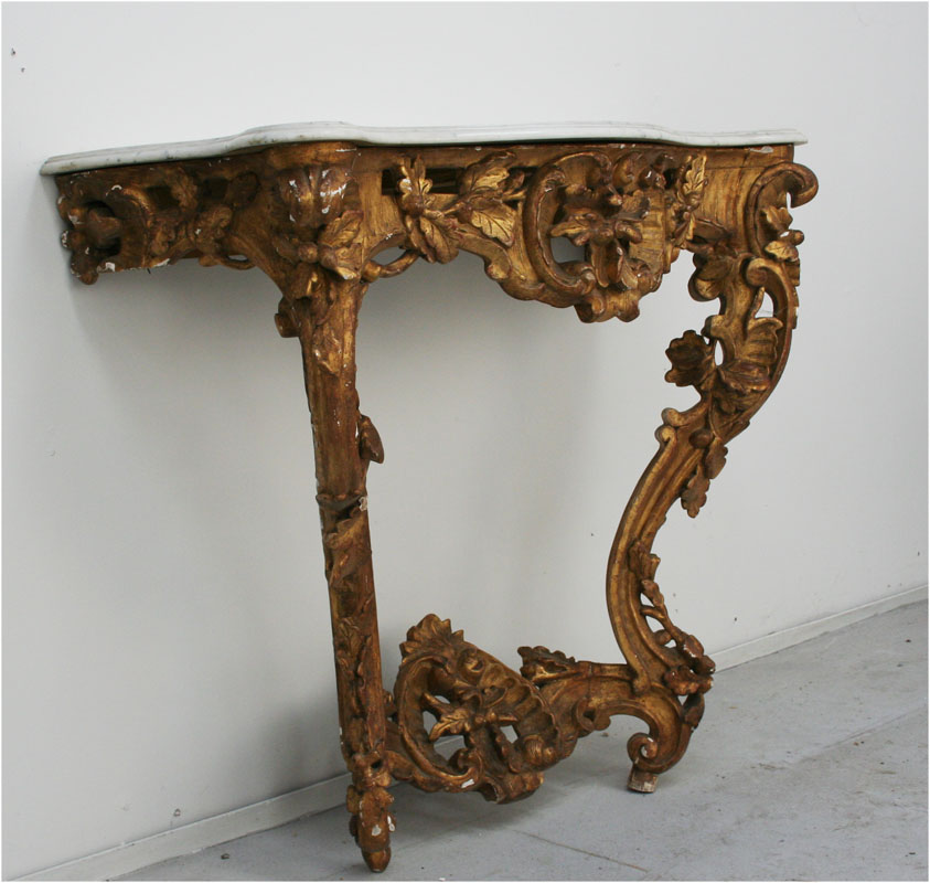 This exquisite console encapsulates the splendor and riches of the Baroque period , the natural organic asymmetrical forms of the Regency period and the lightness and elegance of the Rococo. It is heavily carved with asymmetrical scrolls , oak leaves and acorns. It is set on serpentine cabriole legs with scrolled feet. The workmanship is outstanding and the marble is original.