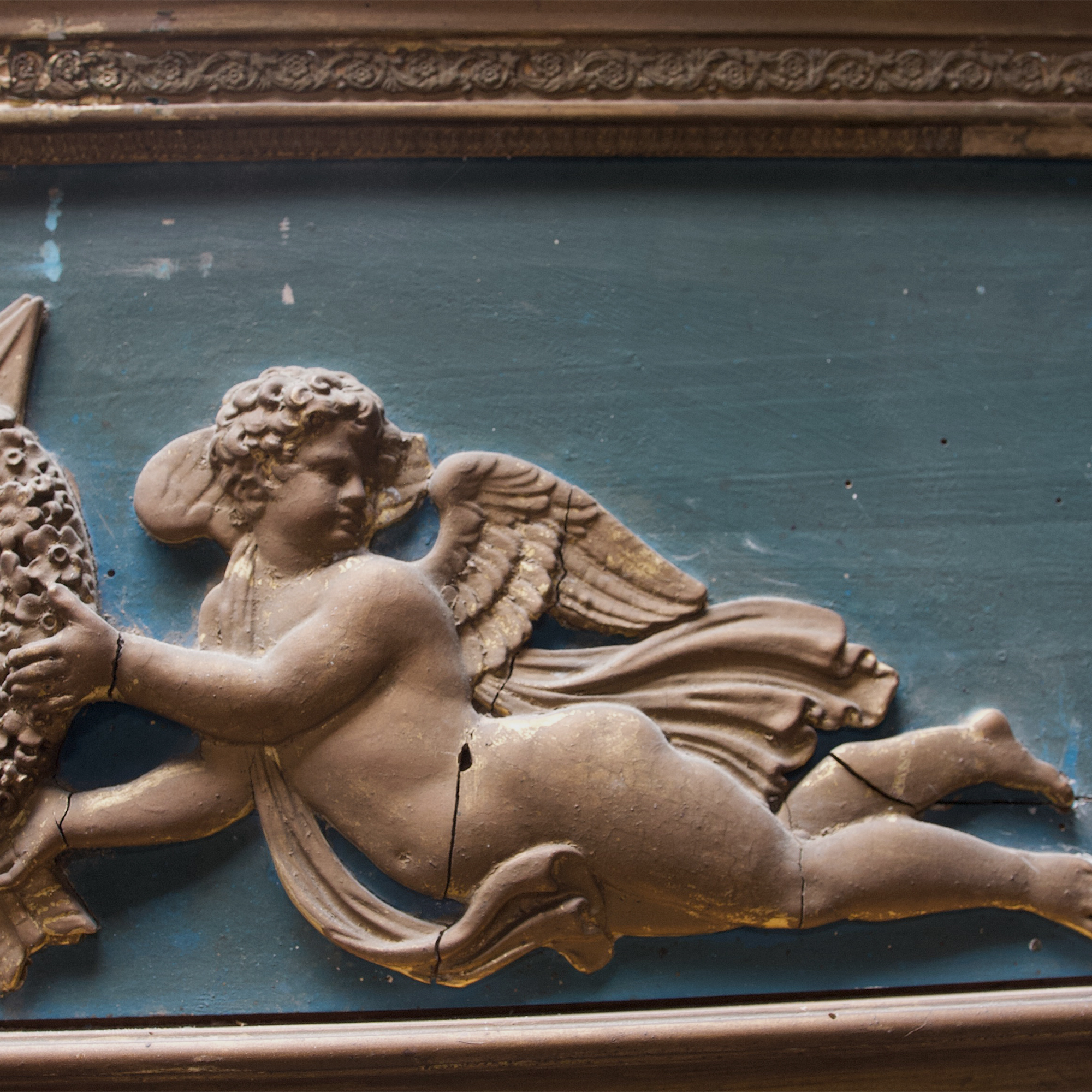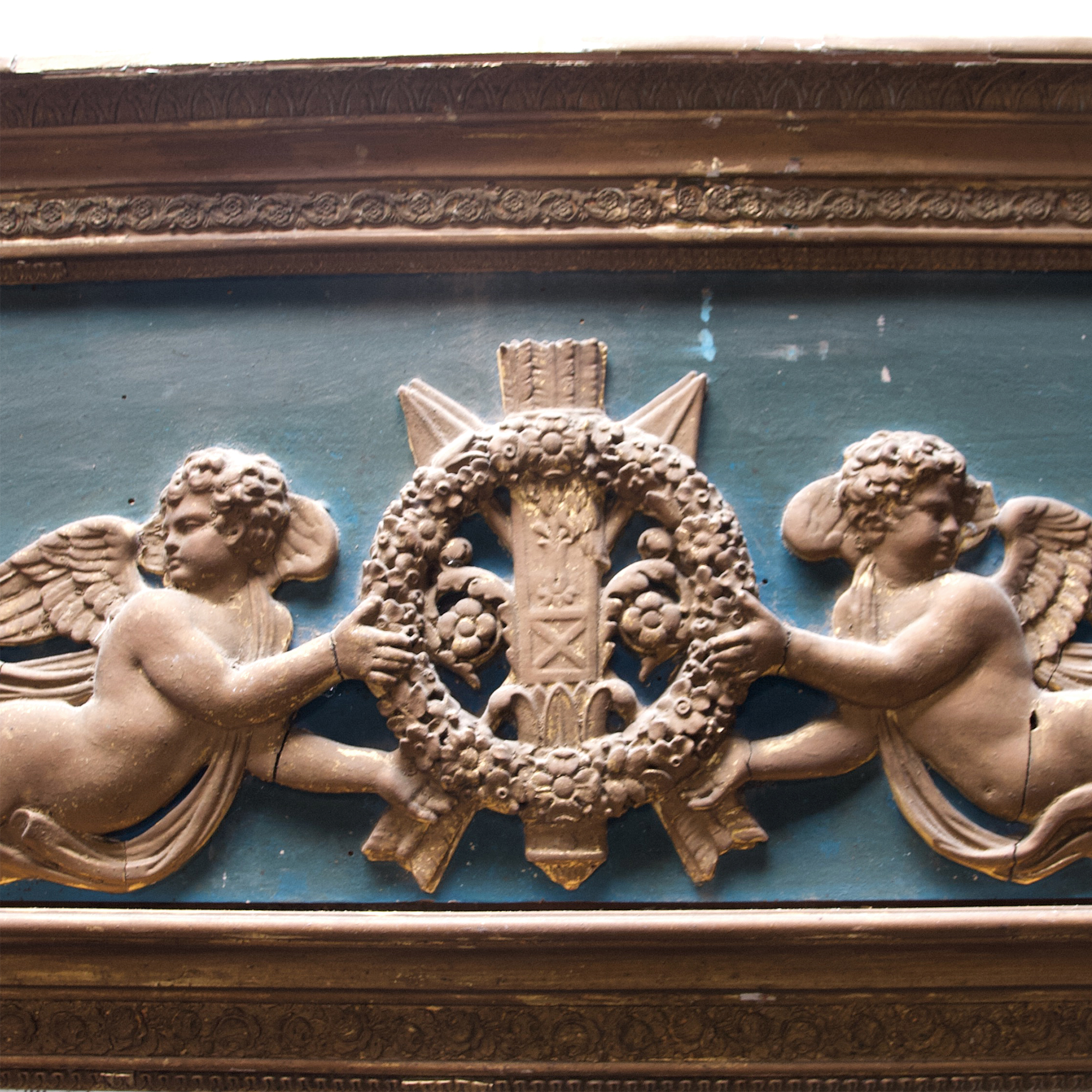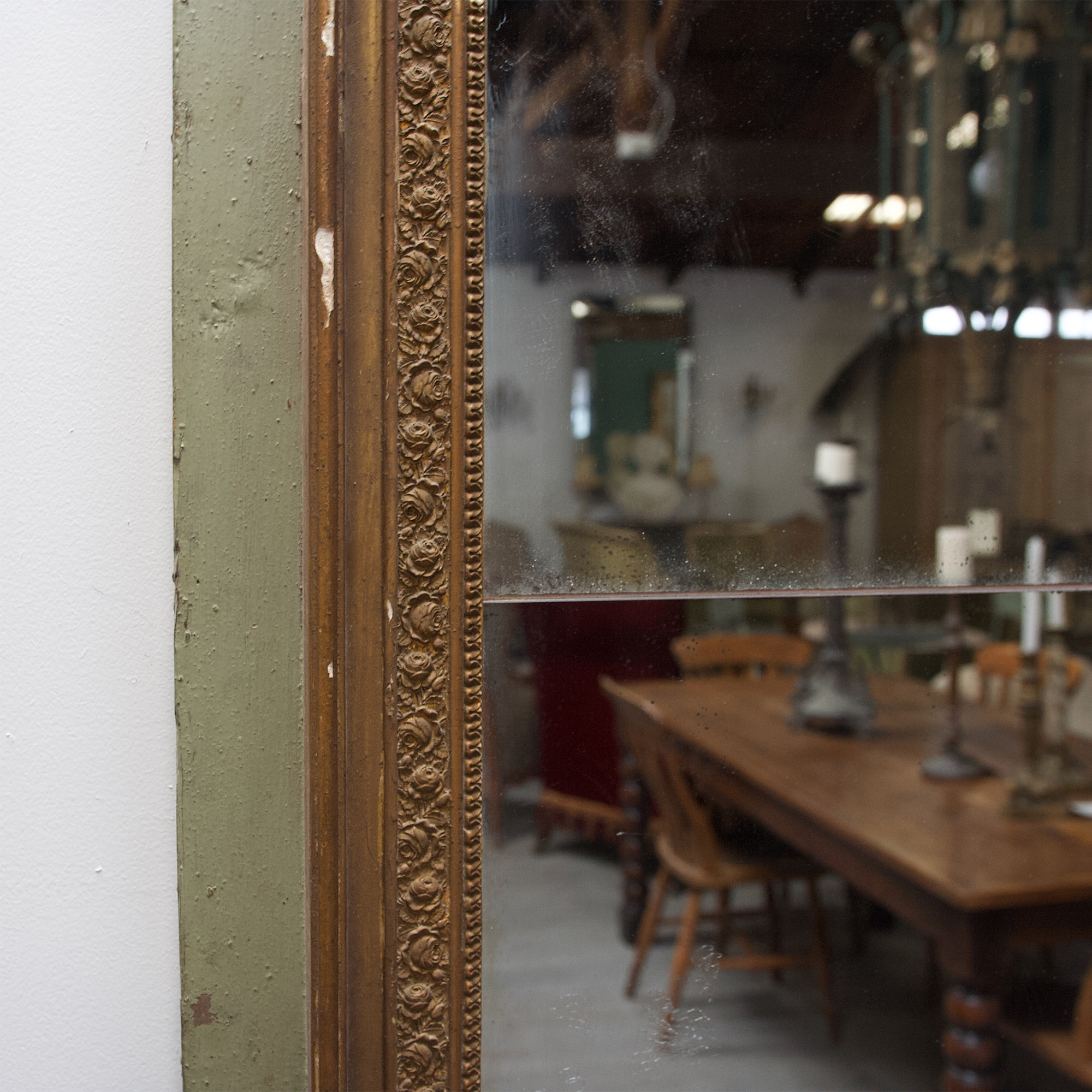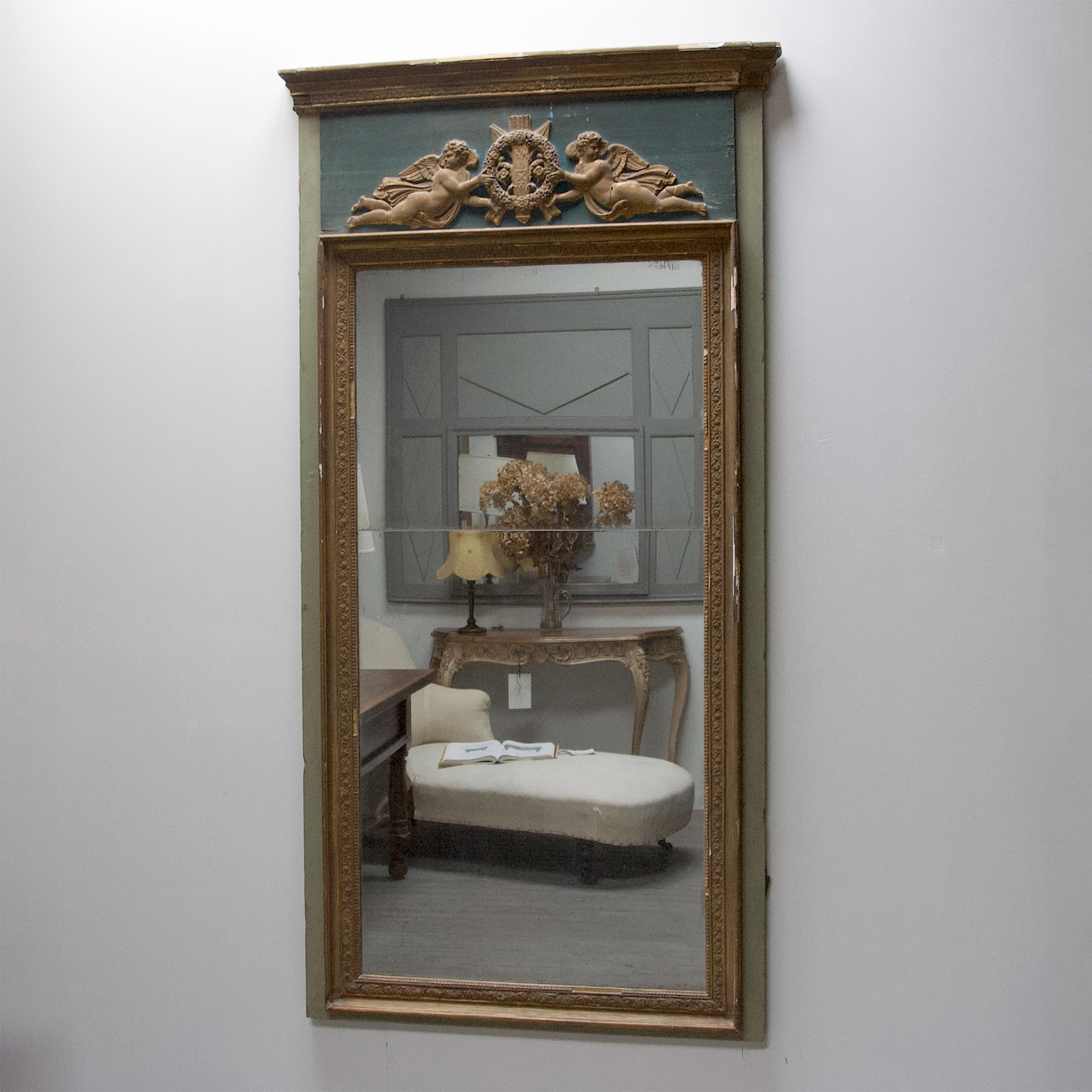 An exceptionally decorative, French, 19th century, Empire period trumeau with gilded putti carrying crossed arrows, a quiver and a wreath. Beautiful original faded emerald green paint and original gilded finish. This charming mirror is in superb original condition with a little chipping commensurate with its age. A stunning feature piece for a discerning home.