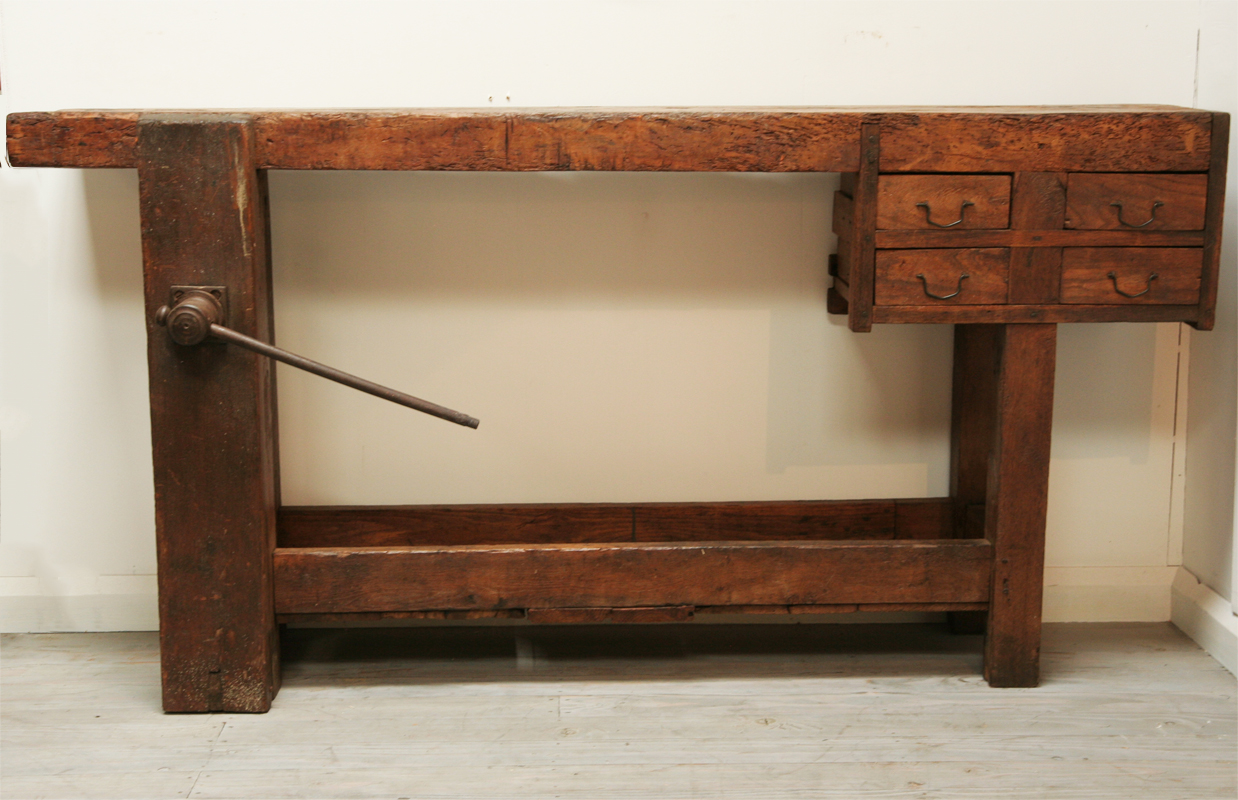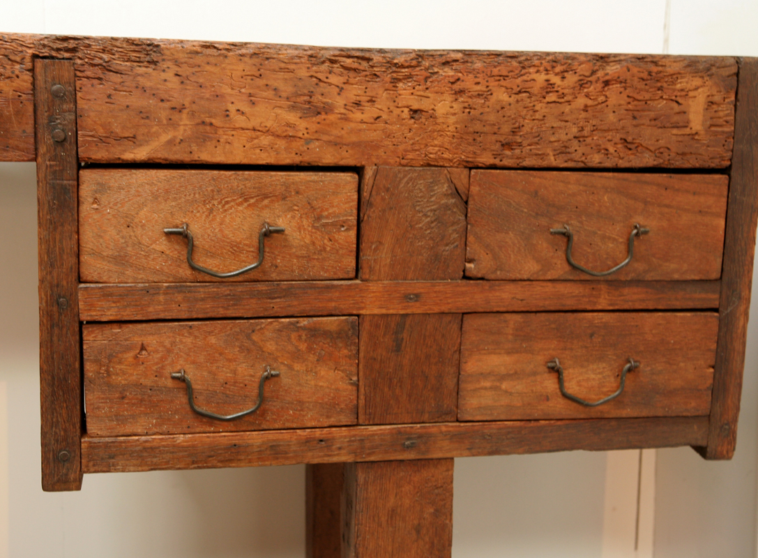 A charming 19th century workbench from the South of France. This gorgeous workbench has the ideal proportions for a hall or sofa table - not too deep so that it won’t protrude into the room too much but still a lovely length. It is oozing character and doubtless has many tales to tell, beautifully patinated and adorable little drawers at one end.
