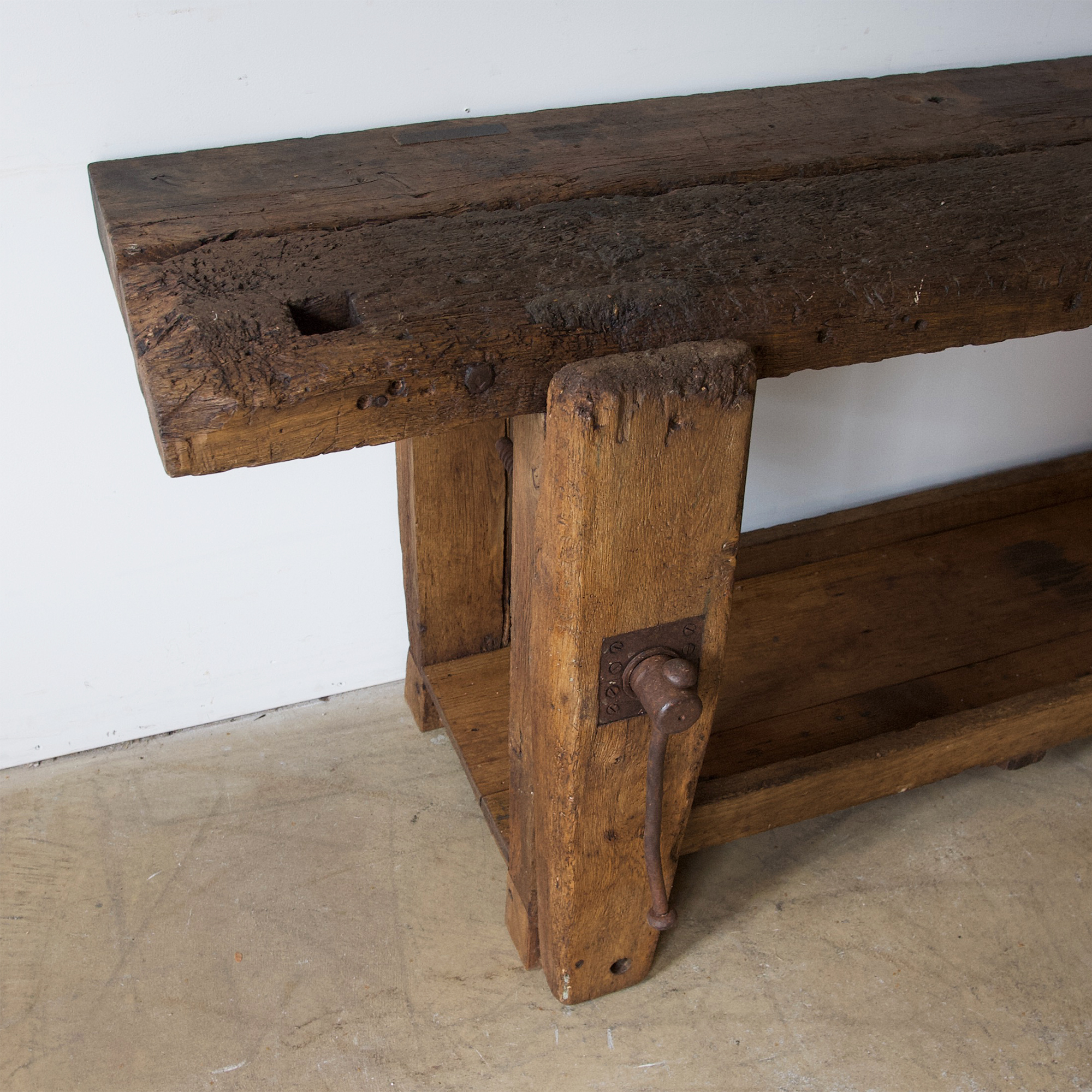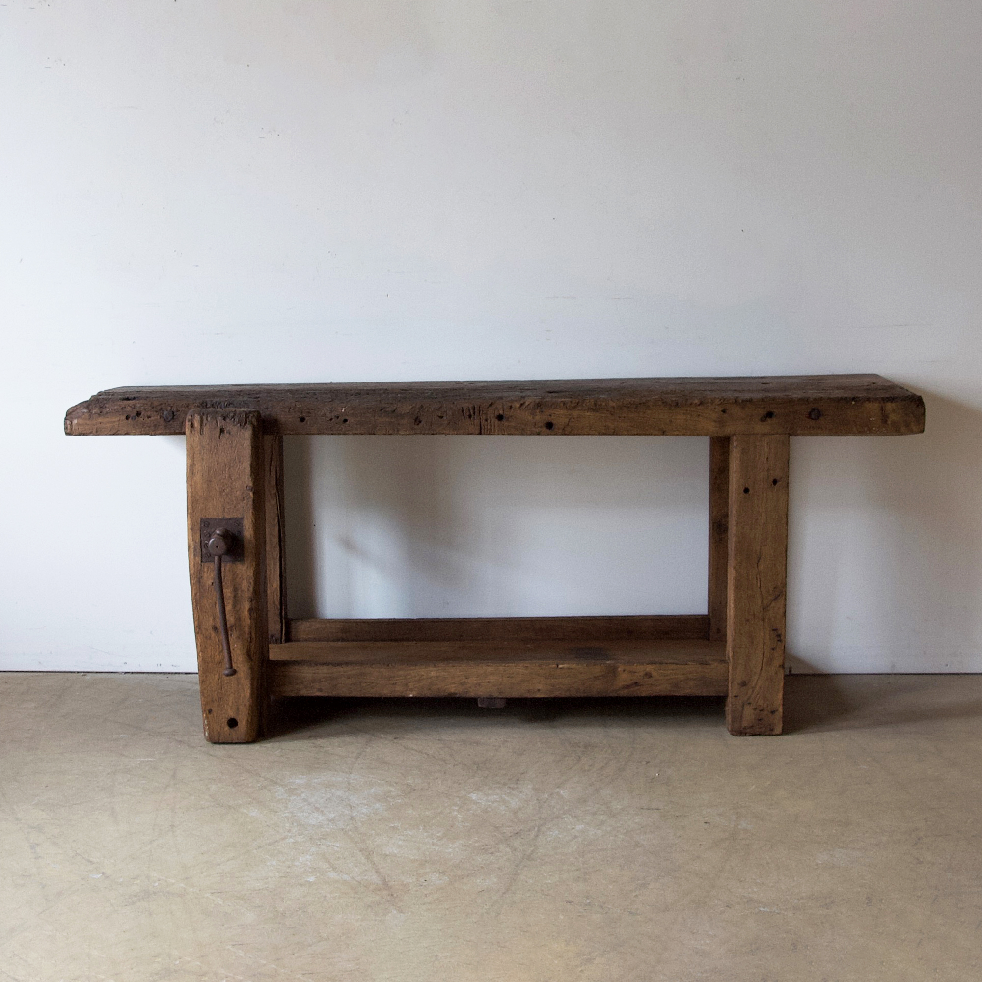 A stunning French, 19th century workbench. Rustic, sculptural and weighty - a fabulous feature side table or sofa table for a modern home.