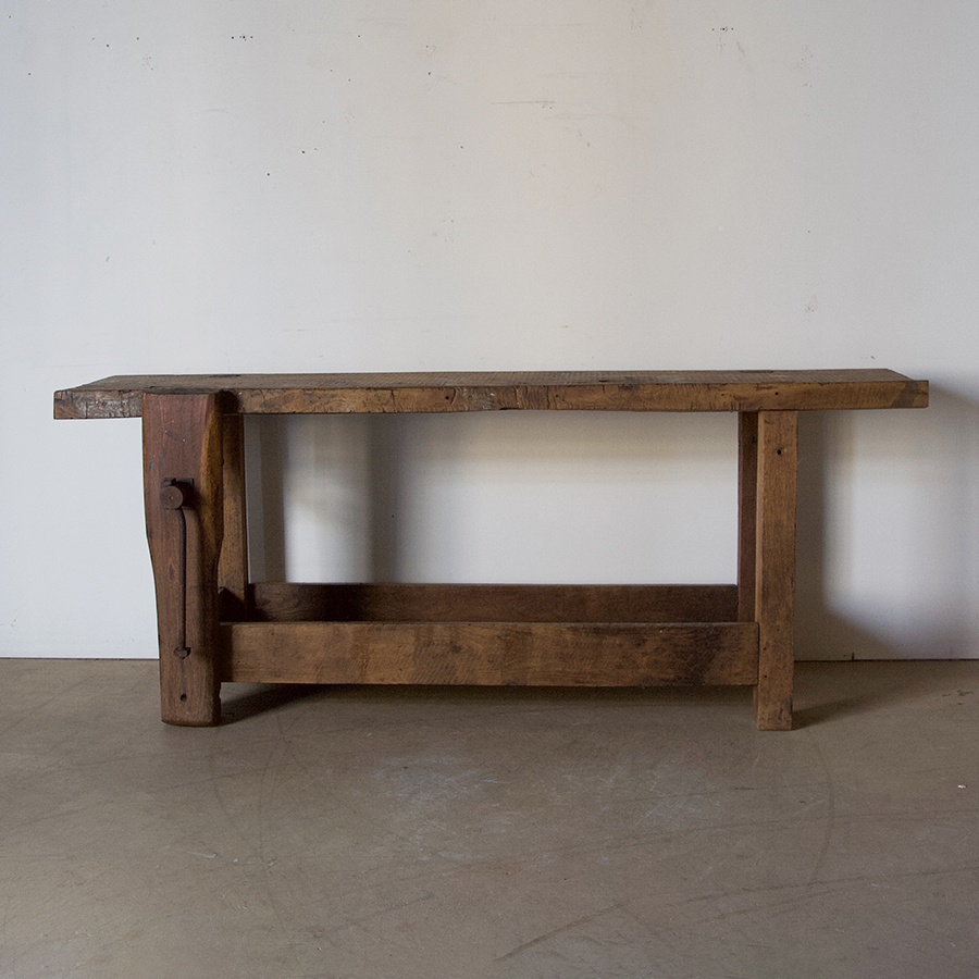 A characterful late 19th / turn of the century, French beech workbench from an artist's studio in Lyon. Thick pit sawn timber top and original vice. Stylish and sculptural - a wonderful rustic hall, console or sofa table for a modern interior.