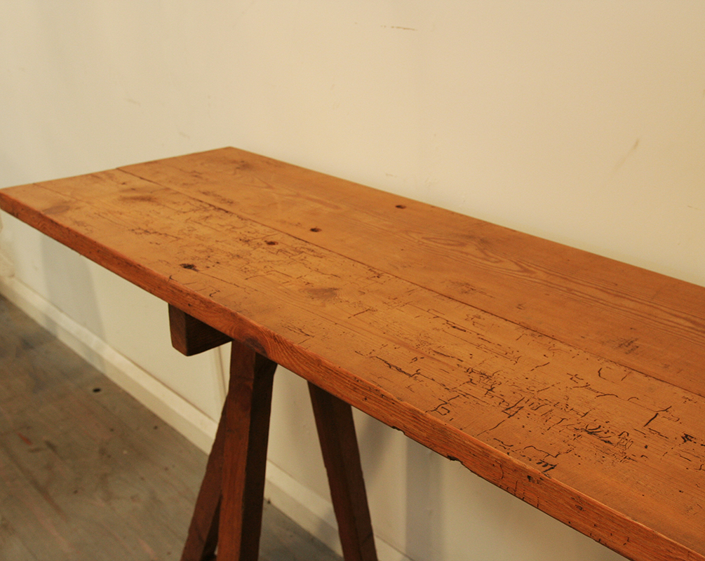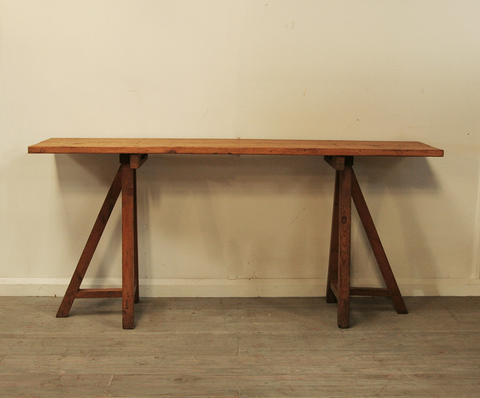 An early 20th century French artist's trestle. A beautifully pared back simple side or sofa table with character. Attractive and sculptural, this table would sit well in a contemporary or rustic interior.