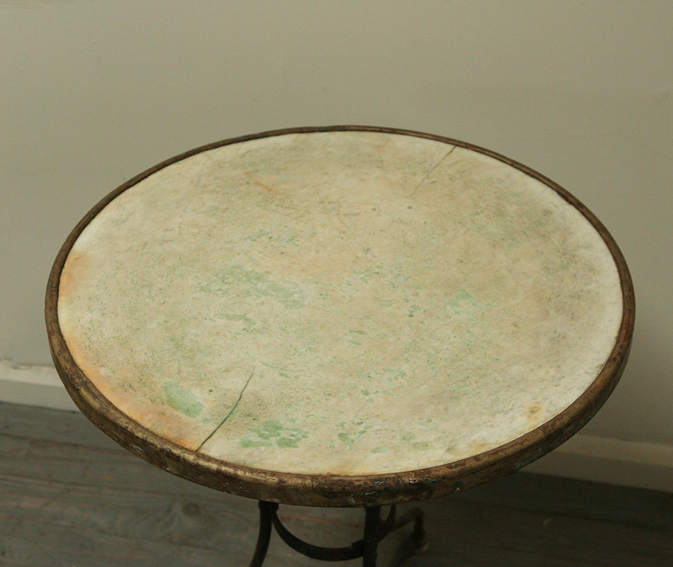 A beautifully patinated, early 20th century French bistro table with a brass banded weathered marble top.