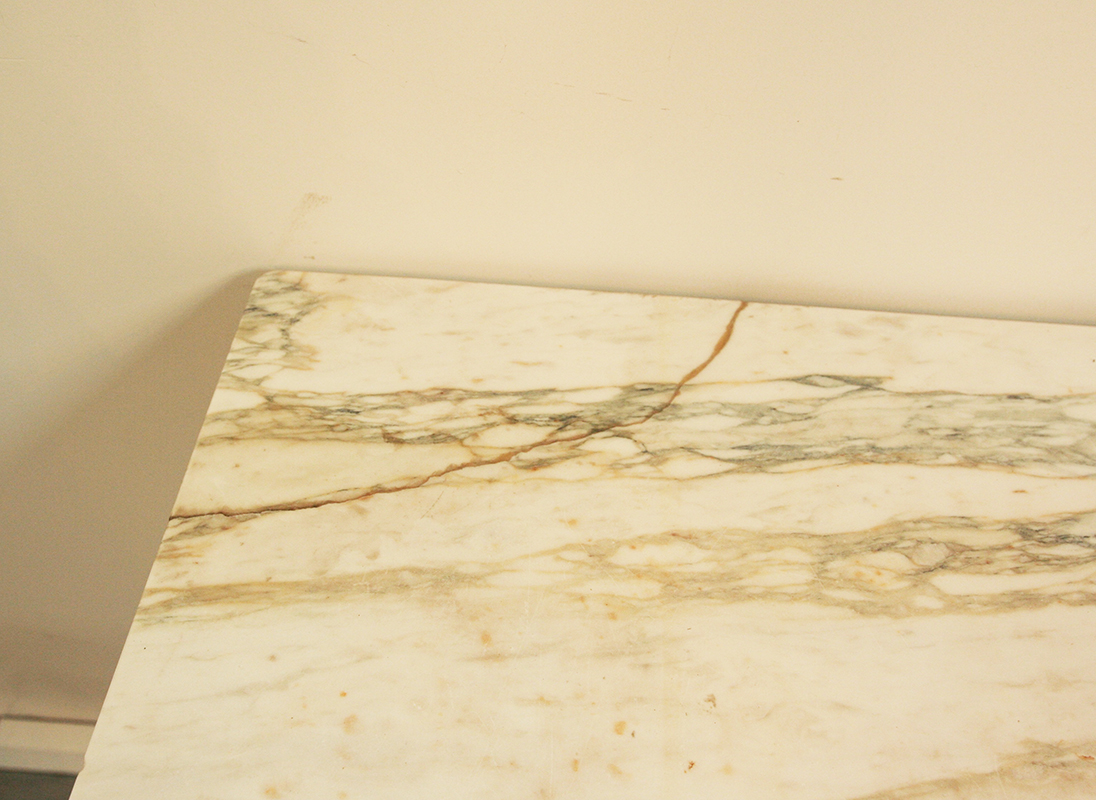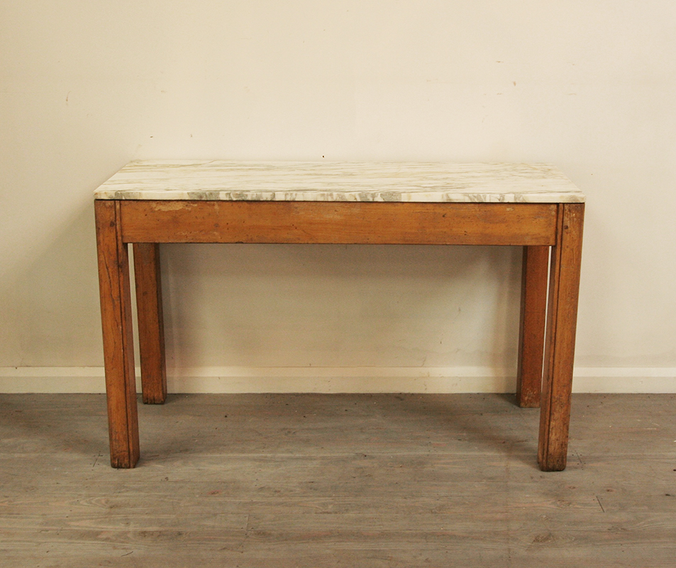 A characterful, early 20th century, French butchery side table. This pretty little table has it's original marble top and faux grained finish. A decorative and unusual table for a hallway, living room, bathroom or kitchen.