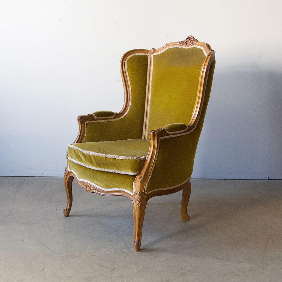 A pretty, French, turn of the century, louis 15 style bergère - wooden carved frame and wonderful, yellow, cotton velvet upholstery. In superb condition, practical yet decorative - a charming seating addition for any room.
