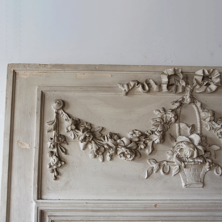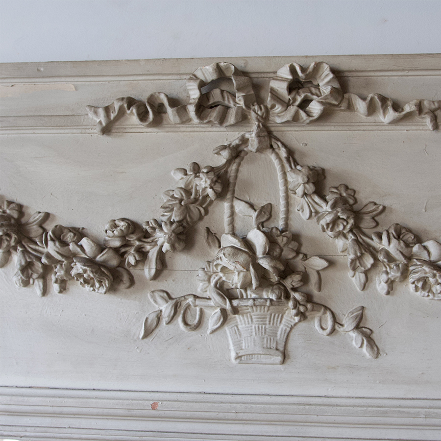 A large and decorative, French, 19th century mirror in the Louis 16 style. This beautiful mirror has its original painted finish and original glass. There is some foxing to the glass and a scratch. The floral swags and corbeille are typical Louis 16 motifs. A wonderful example of French, 19th century, Louis 16 revival - generous dimensions, gorgeous dove grey painted finish - a lovely feature piece for any room.