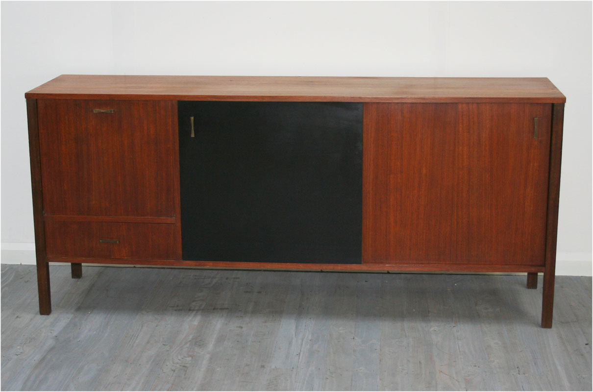 This is an exceptionally stylish French modernist sideboard in the style of Alain Richard. The sideboard dates from the 1960's and is crafted in pallisandre ( rosewood ) with a single black lacquered door. The doors and drawers are detailed with bronze handles cast in an organic form . The lines are pure Richard and this may well be one of his design's at the very least he provided the inspiration for this sophisticated enfillade.