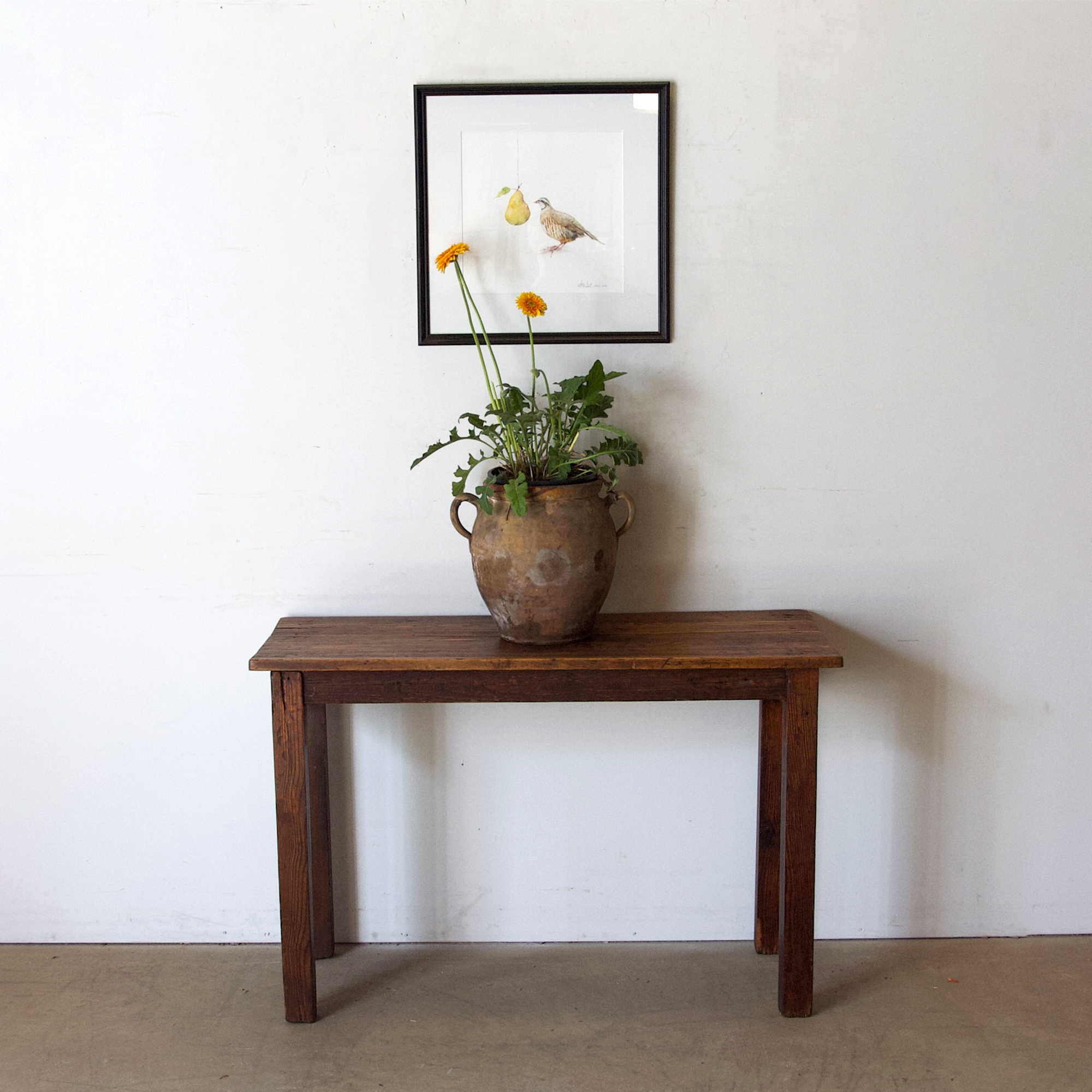 A delightful, French, early 20th century, rustic side table. Crafted in pine, with beautiful, time worn patination and the perfect dimensions for a hallway. A wonderful, characterful, side table for a modern home.