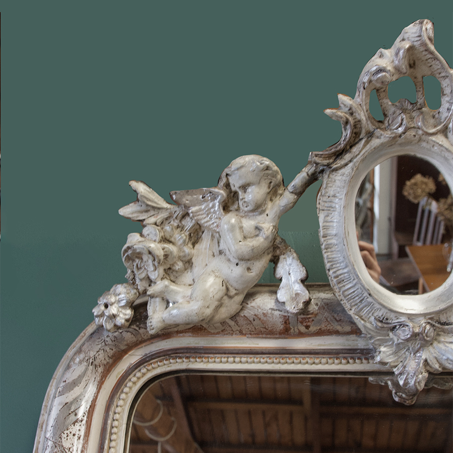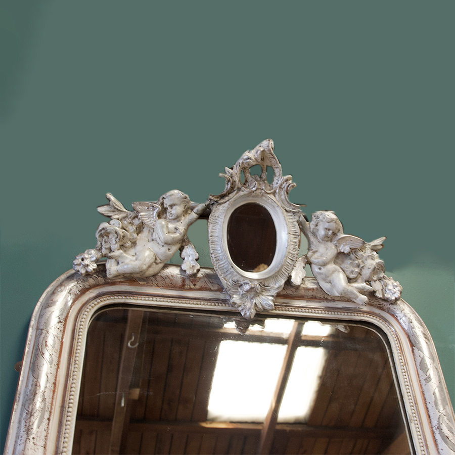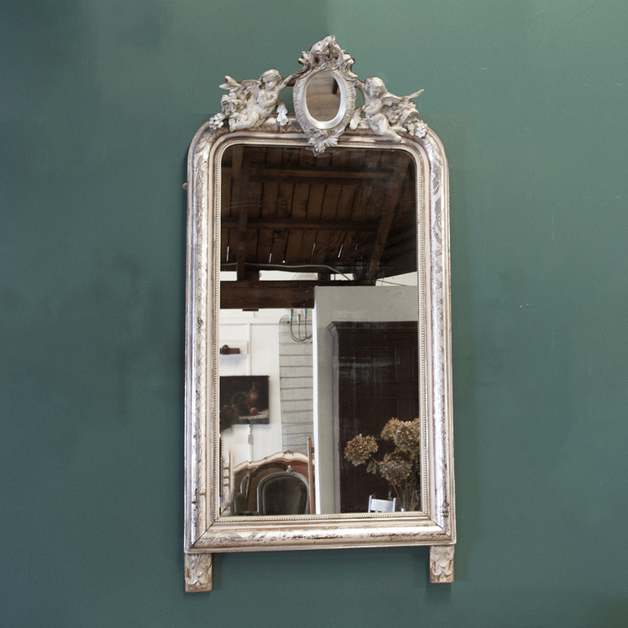 An extraordinary and decorative, French 19th century, silver gilt mirror dating from the Louis Philippe period circa 1850. Elaborately decorated with putti, flowers and leaves. Original glass, some historical restoration to the moulded crest, wooden back. A whimsical and elegant feature mirror for any room.