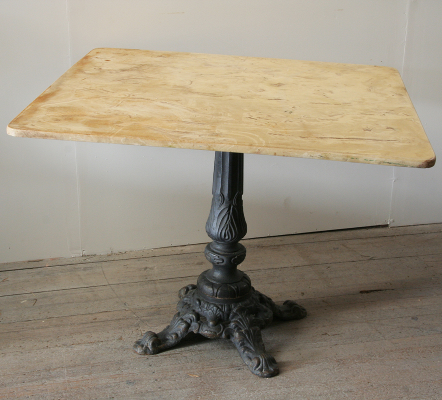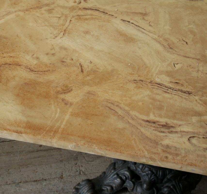 An unusual and decorative French cast iron table de jardin with a square caramel coloured stone top. A generous size, the perfect table for dining en plein air !