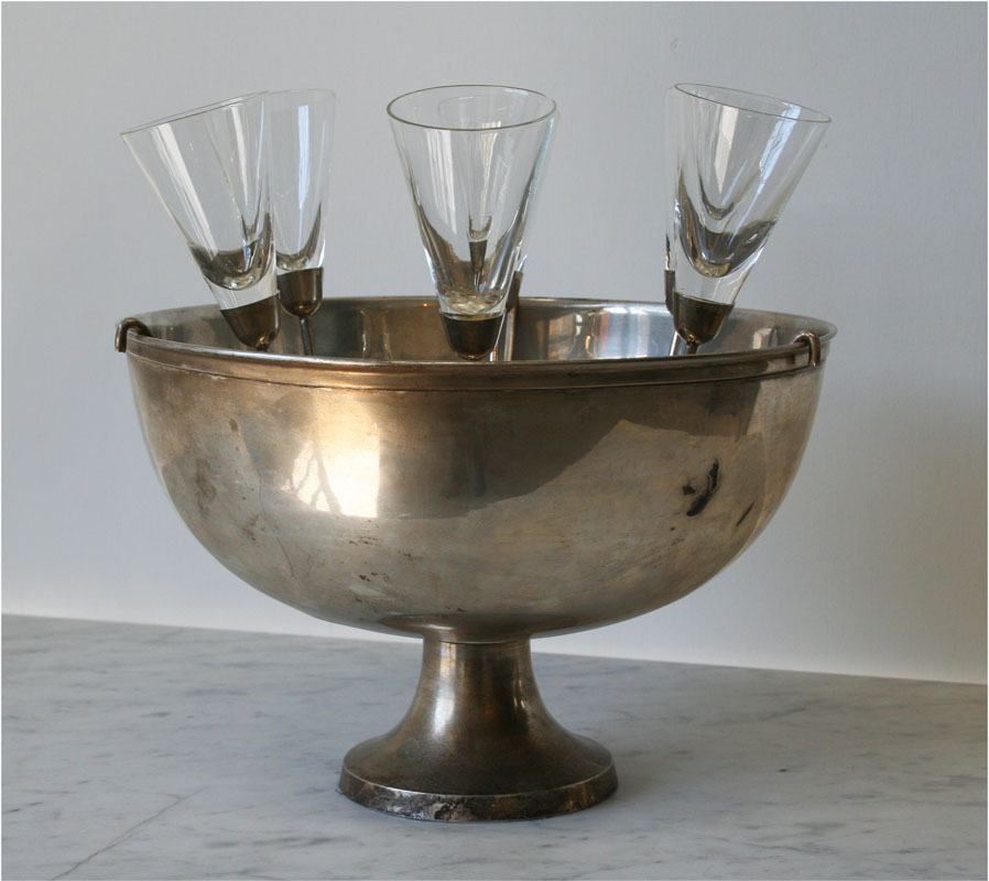 The most stylish French 1970's large champagne bucket and matching footless champagne flutes. A very glamorous way to serve your champagne - these glasses are intended to be held and sipped rather than left standing .