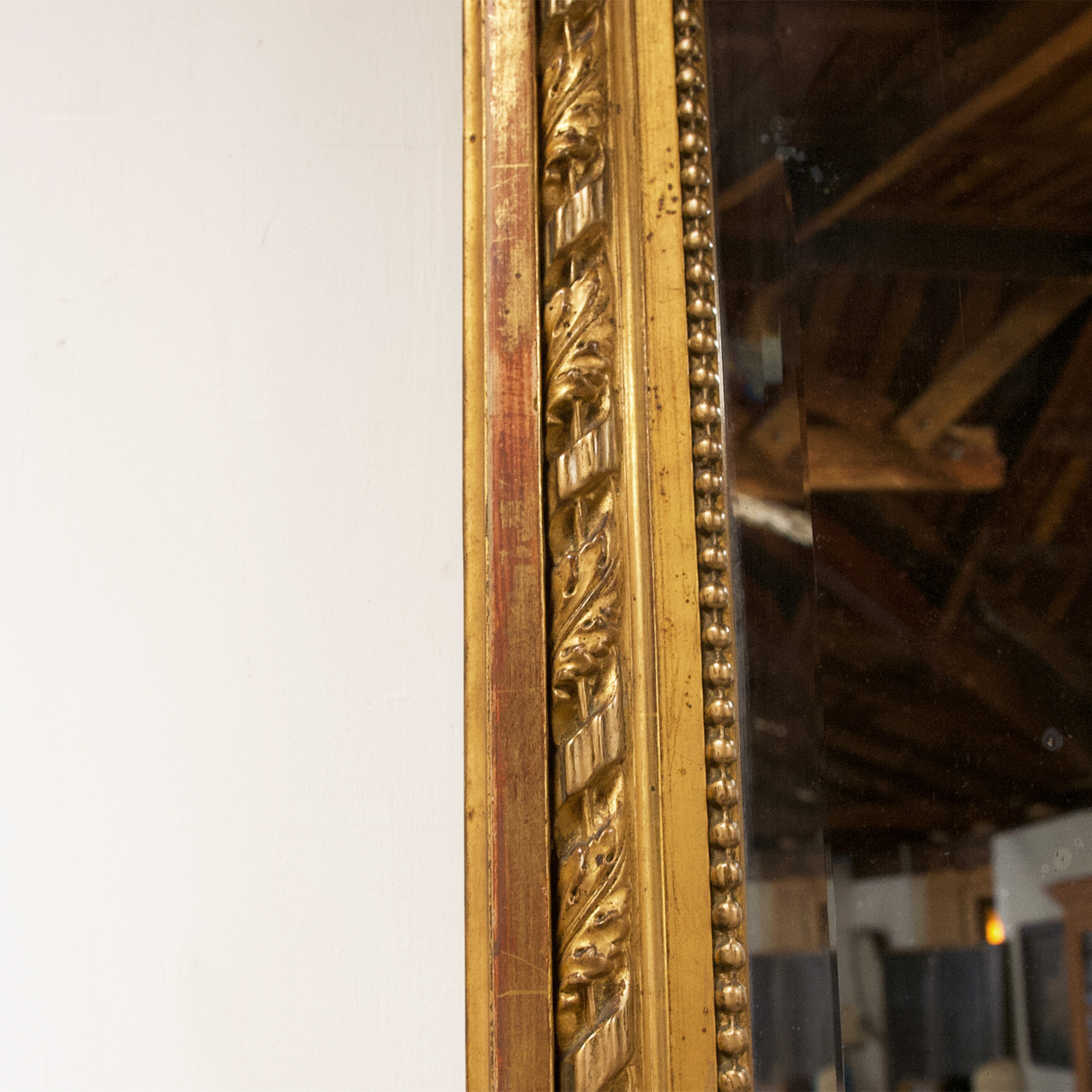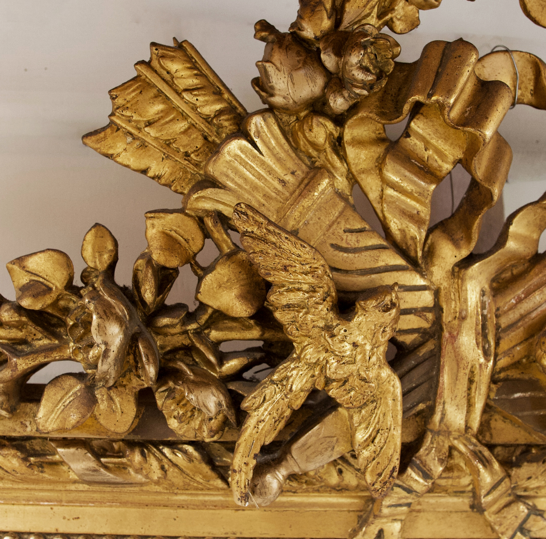 An exceptional and large French, mid - late 19th century, Napoleon III period, gilt mirror in the Louis 16 style. Neoclassical symmetry, ribbon cresting, crossed quiver and torchère, laurel wreath and doves. Original mercury style beveled glass and original water gilding. A decorative and superb quality feature mirror.