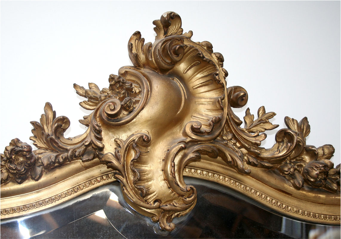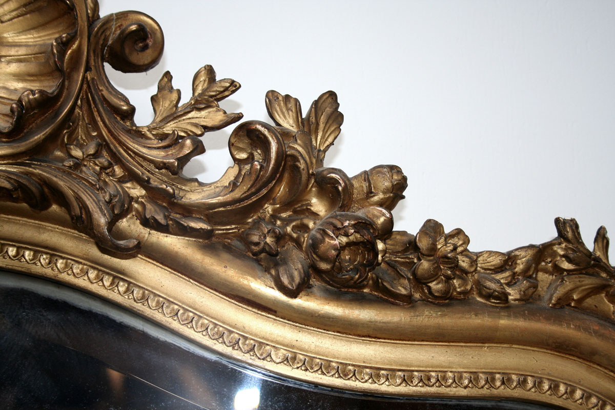 This is a large and elegant late 19th century / early 20th century French gilt mirror in the flamboyant Louis 15th style. It has all the distinct florid motifs associated with Louis 15 - garlands of flowers tumble from the central serpentine lozenge and leaves curl to decorate the corners. The carving is typically asymmetrical reflecting the fascination for the natural world at this time. The mirrored glass is original and bevelled.