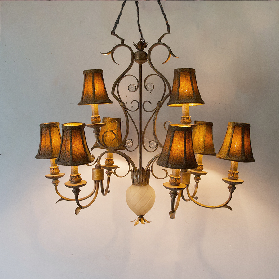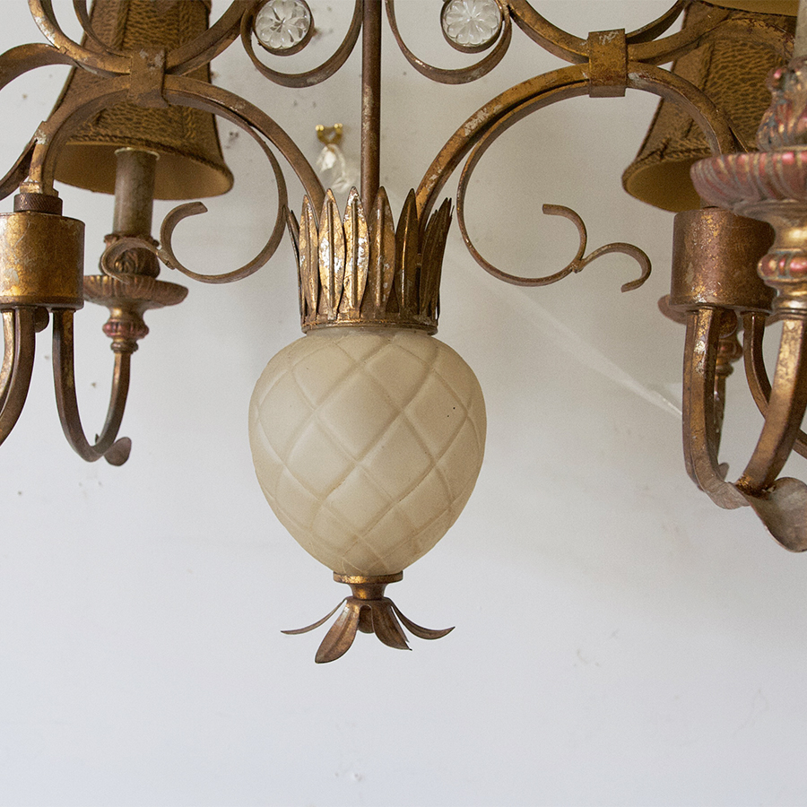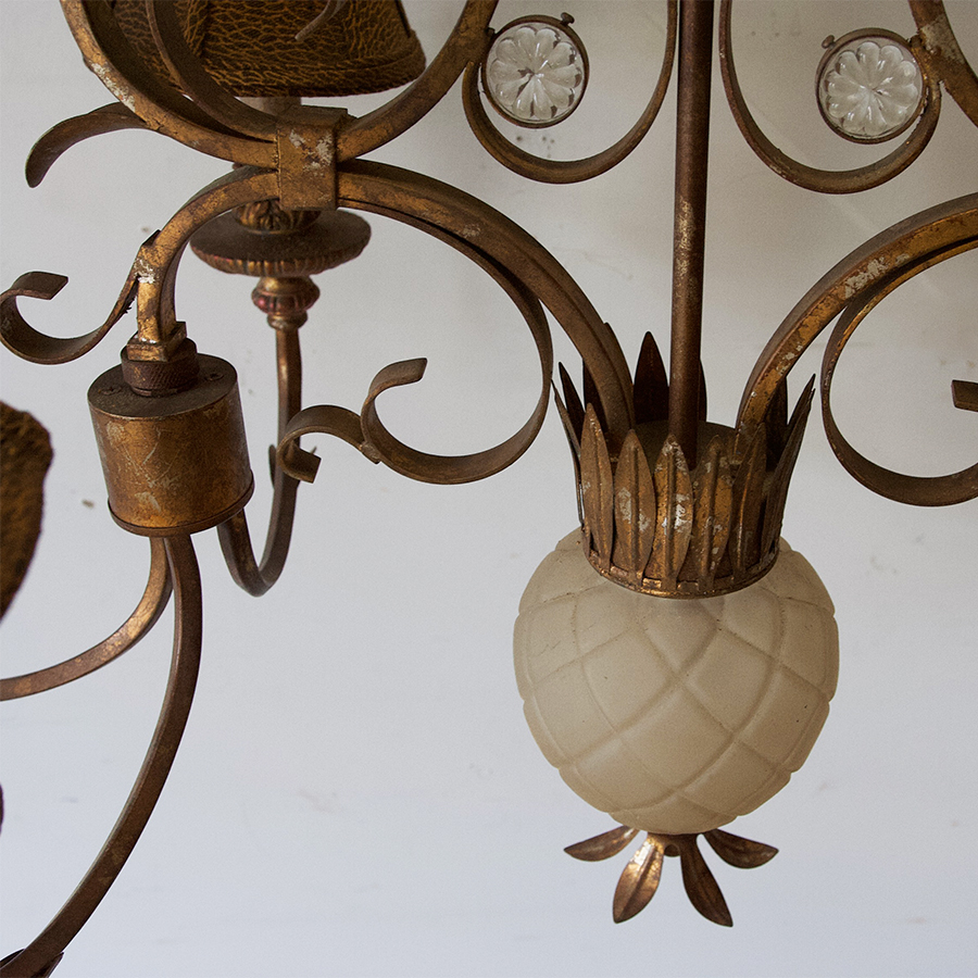 A fabulous 20th century, decorative, luxe, pendant light fitting in the style of Maison Charles. A tole crown adorns a glass pineappple, glass floral lozenges, scrolled wrought iron and original fabric shades. A stunning and chic feature light for a modern interior.