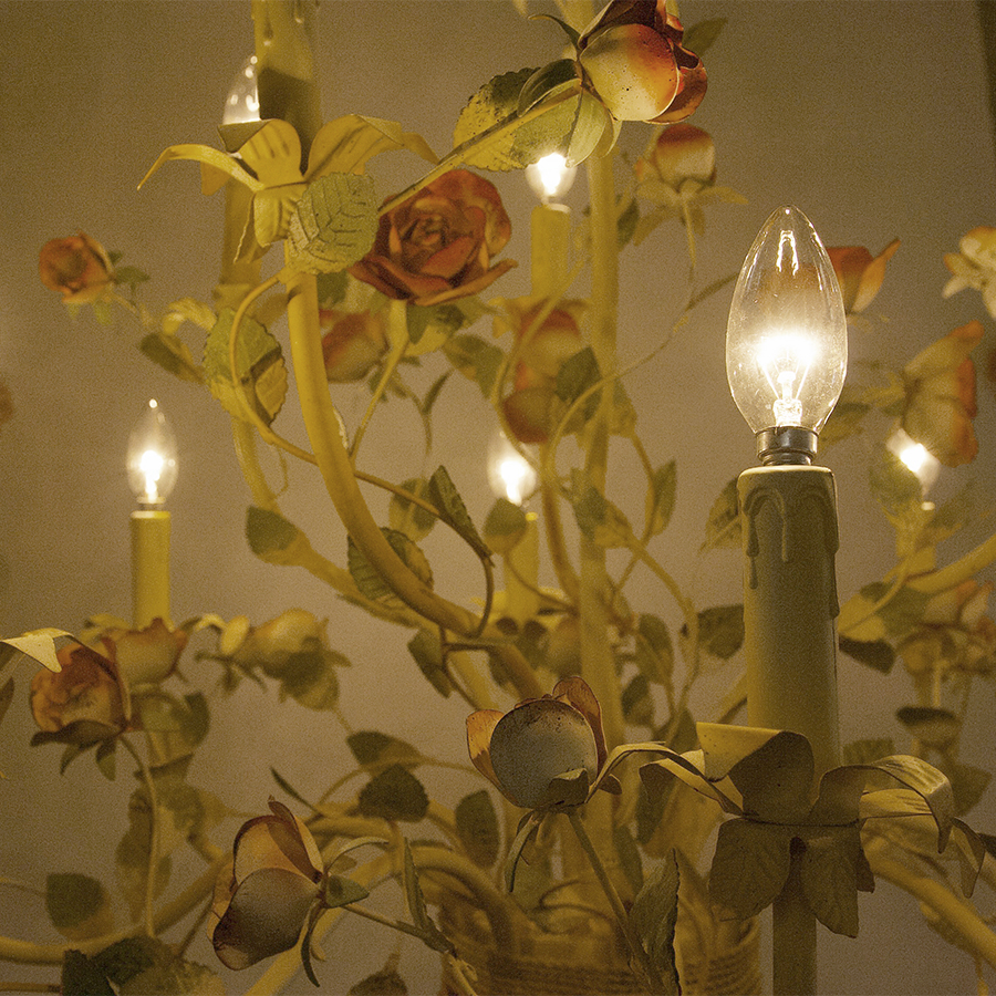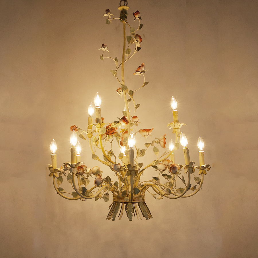 A large and lavish vintage tôle chandelier - this beautifully decorative chandelier is a late 20th century reproduction of a French chandelier. Exquisitely and intricately crafted in metal, the chandelier depicts flowers and vines and is painted in a pretty palette of reds, pinks, yellow and green.The chandelier is large - height 1000 mm and width 950 mm - it would make a stunning, whimsical lighting feature for a modern interior.