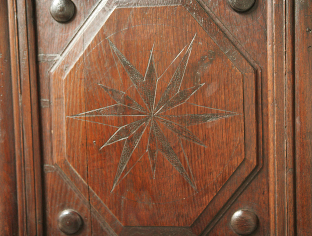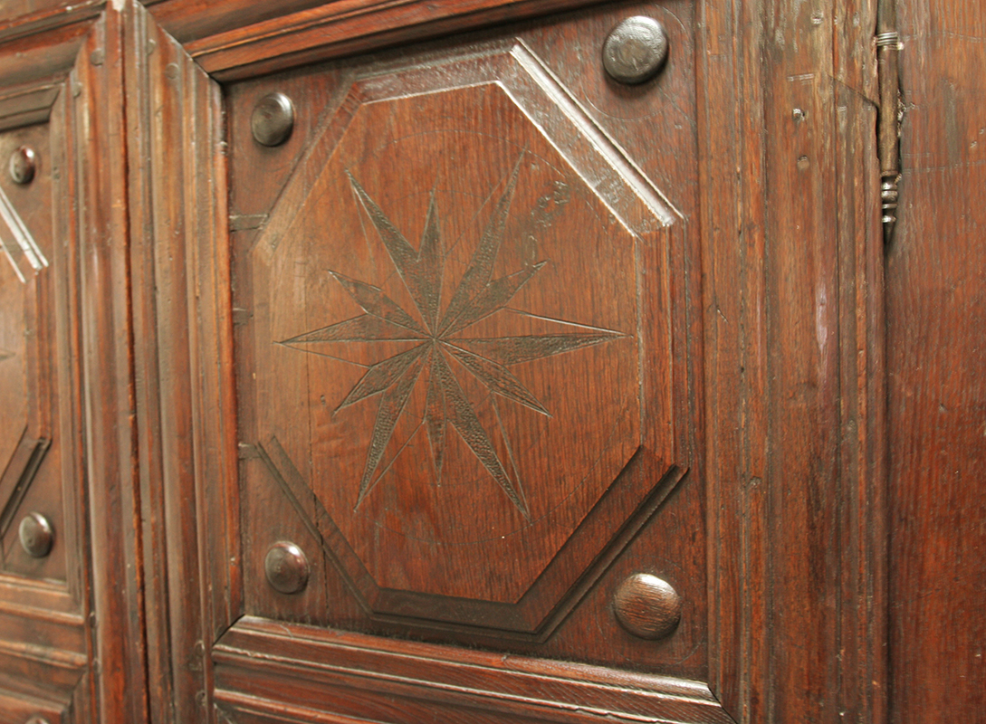 A late 17th Century Spanish Armoire. The armoire is crafted in chestnut and the wood is richly patinated by time and exudes the warmth of age. The doors are coffered and decorated with hexagonal lozenges with star motifs. This armoire would be the perfect solution to hiding that ugly flat screen television. Decorative, rustic and beautiful - a wonderful feature piece for any room.
