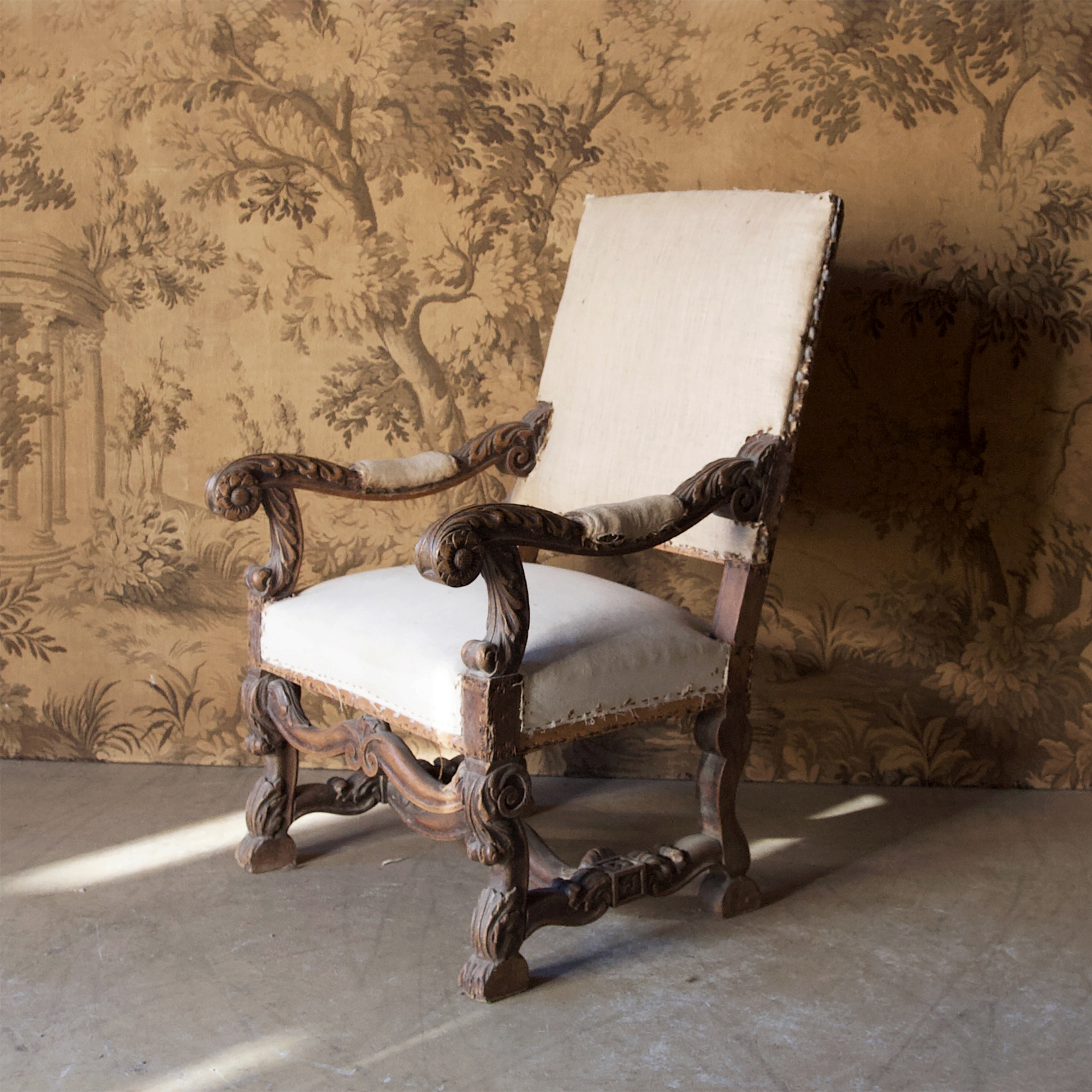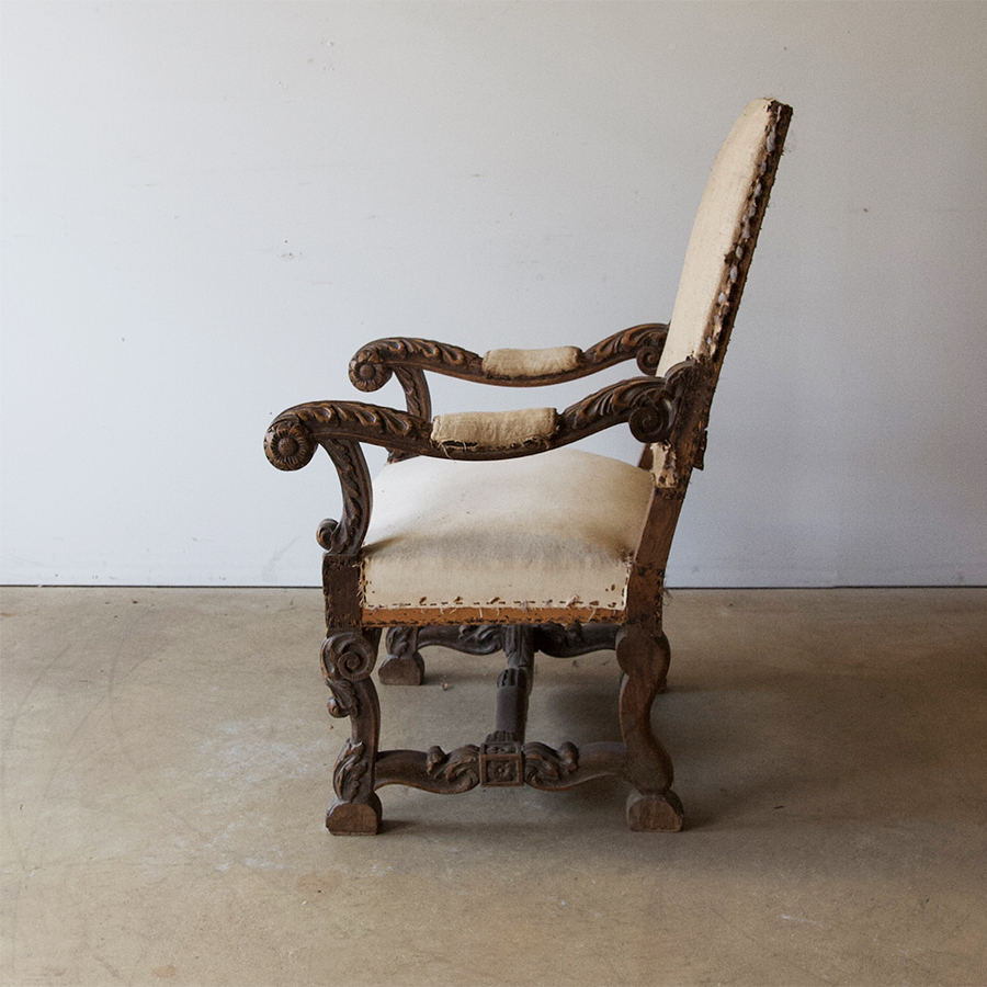 A decorative pair of 19th century, Louis 14th revival fauteuils carved in oak with faded château appeal. Circa 1880. These chairs exhibit all the flamboyancy of Louis 14 Renaissance styling with their serpentine arms and legs. The back height of these chairs is lower than the usual Louis 14 style chair making them visually more elegant and superbly useable. Stripped back and ready to reupholster in the fabric of your choice.