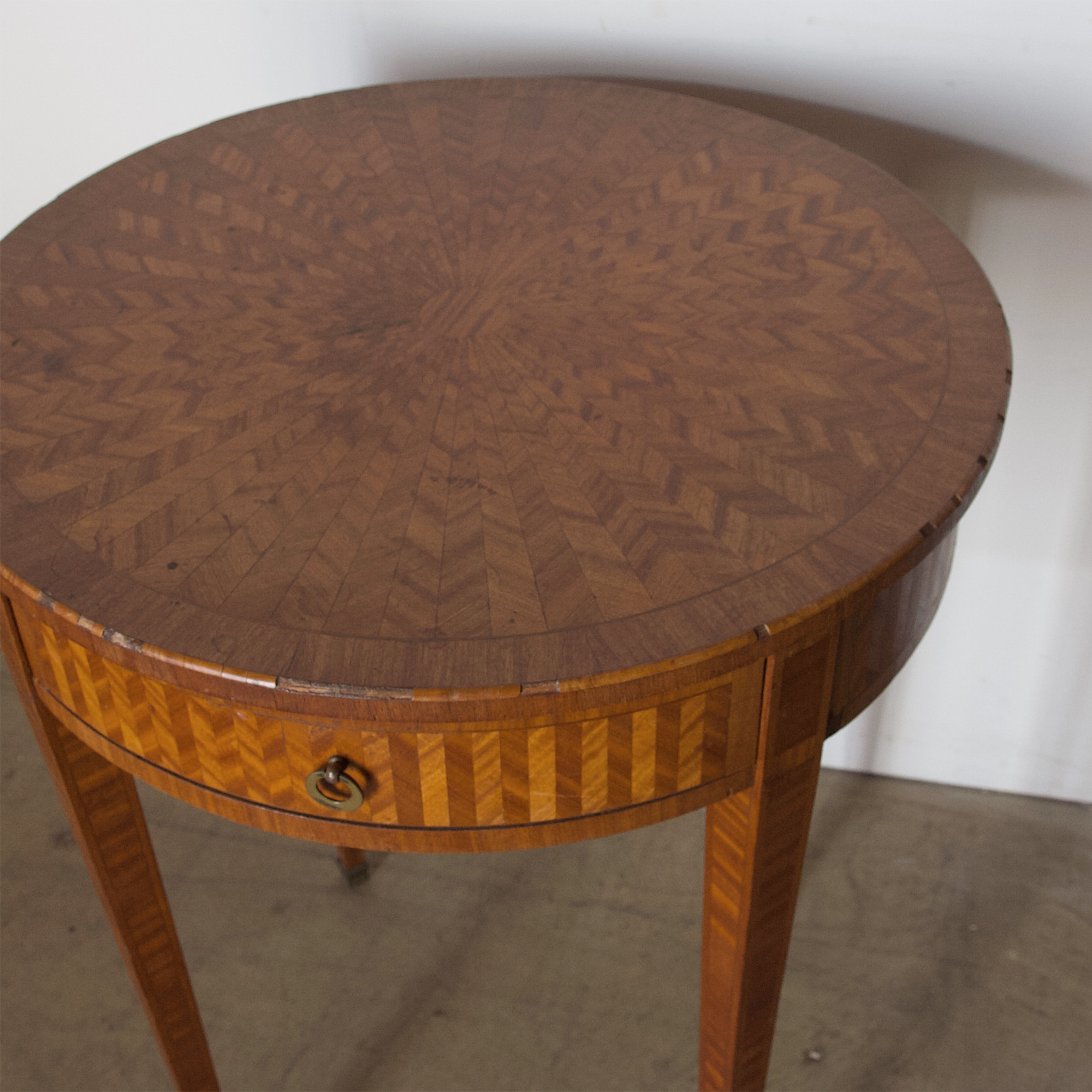 A charming, French petite lamp table in the Louis 16 style. This beautiful table is decorated with an original and intricate marquetry finish in a mix of woods and dates from the late 19th century. A delightful occasional or lamp table. There is some chipping to the marquetry edging - visible in the photos and priced accordingly.