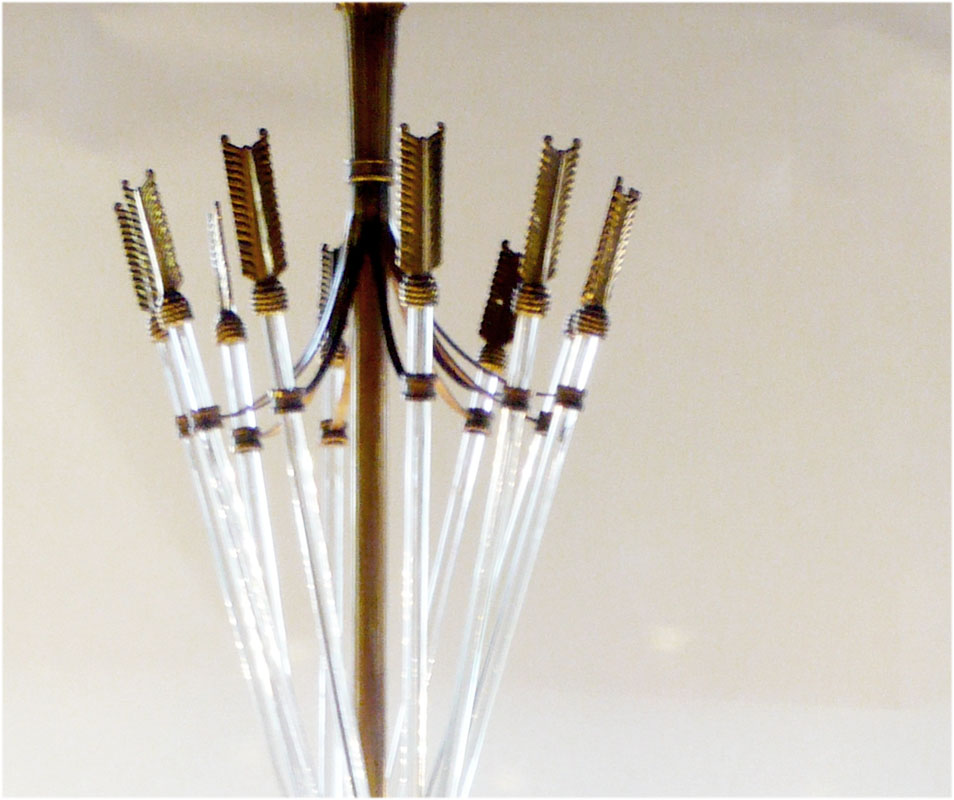 A superb turn of the century, circa 1900, French, gilt bronze and crystal chandelier. This is a large and exquisite chandelier in the empire taste. The chandelier is very finely crafted with detailed castings and crowned with a cluster of crystal and brass gilt arrows. The crown of arrows is classically stately , a motif often used by the emporer Napoleon. The grand dimensions and supreme quality of this chandelier make it an exceptional signature piece. The chandelier would originally have been commissioned for a specific and important interior such as a civic space, grand hotel or château. Today this incomparable chandelier would appropriately grace any modern prestige interior. Rewired and bulb holders replaced to accomodate modern bulbs.