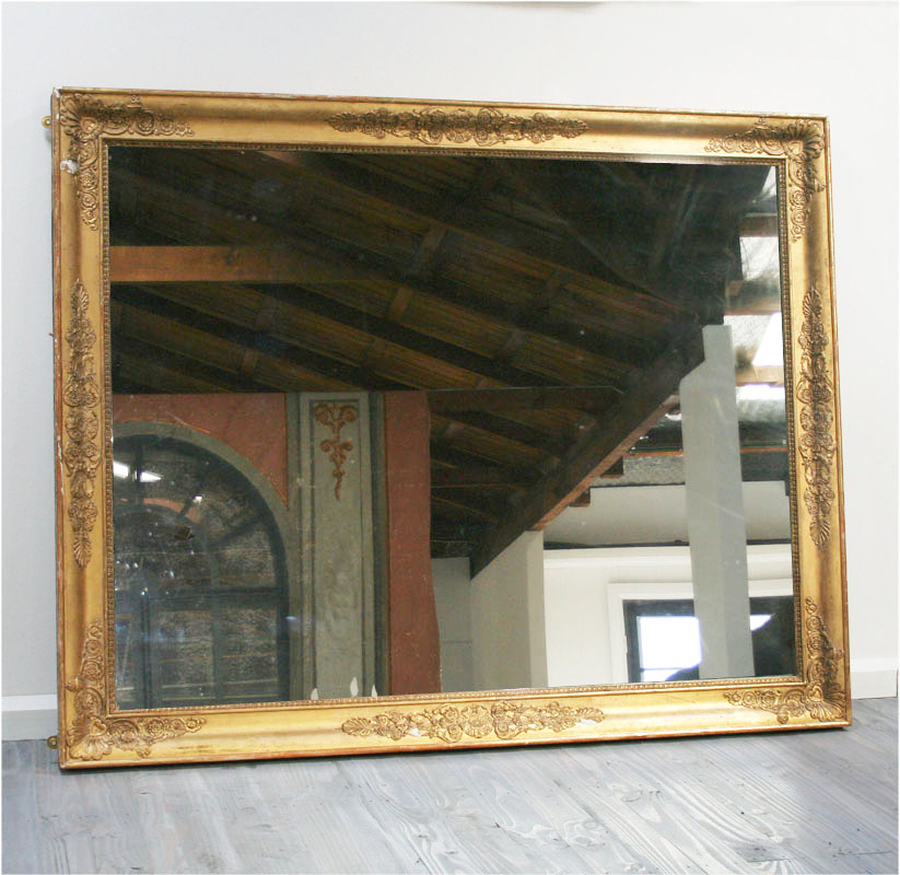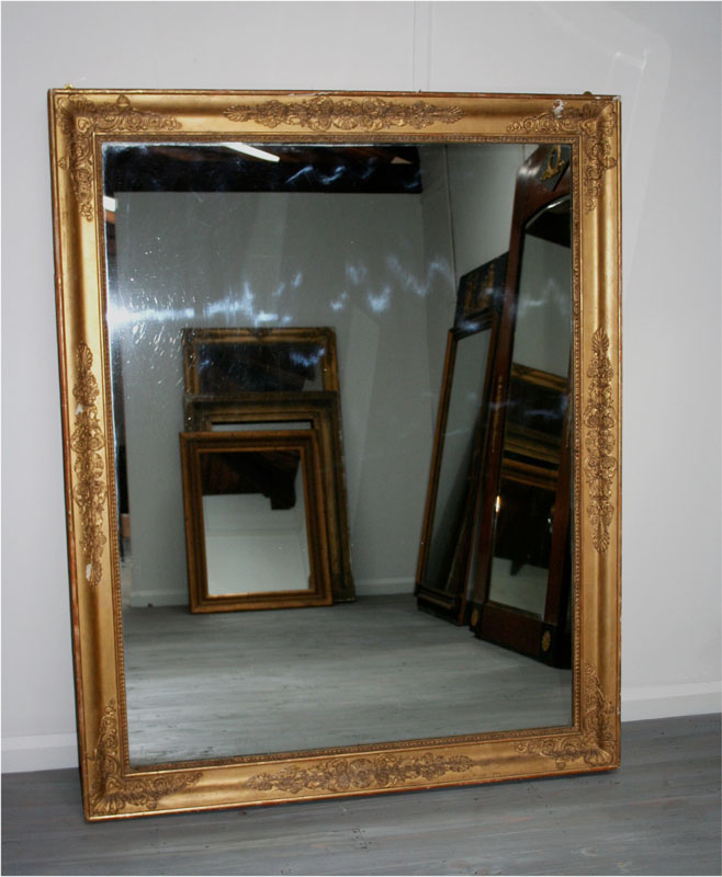 A large , early 19th century - circa 1820 , Empire period gilt mirror with original glass. This mirror has very grand and elegant proportions. The empire decorative motif is restrained and elegant - the perfect feature mirror for a large room. This mirror may be hung vertically or horizontally.