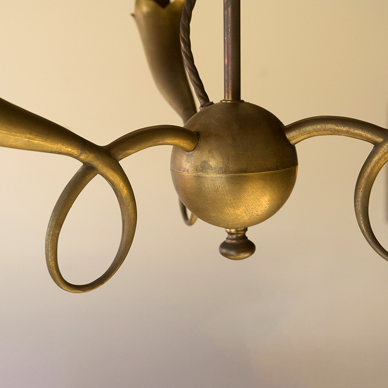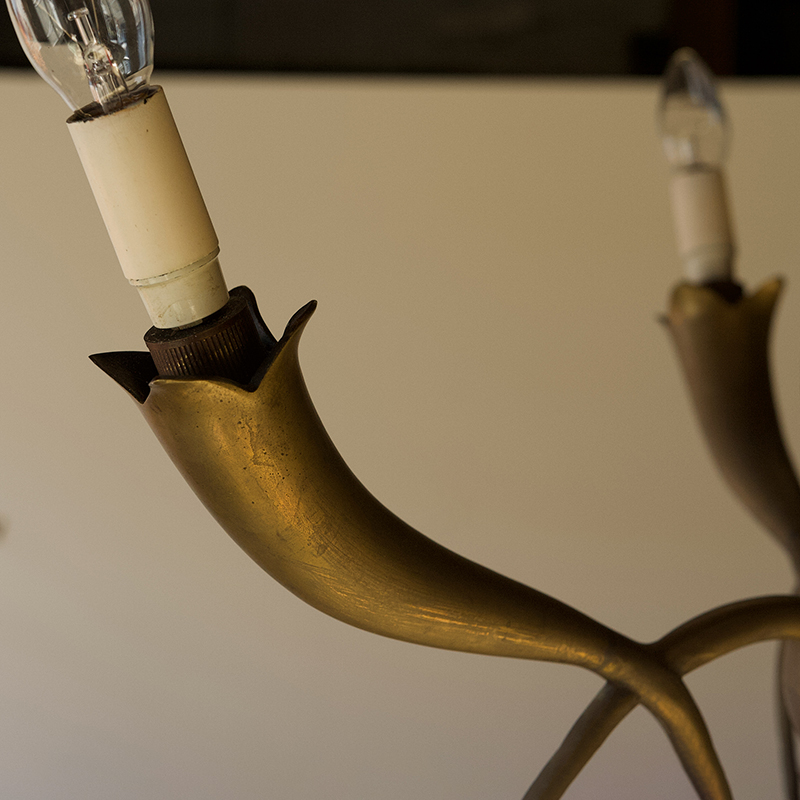 A super stylish pair of French bronze mid century chandeliers. Lovely fluid serpentine shaping and witty trompe l'oeil rope detail - these chic chandeliers are very reminiscent of Gio Ponti. The chandeliers are priced individually at $1100 each.