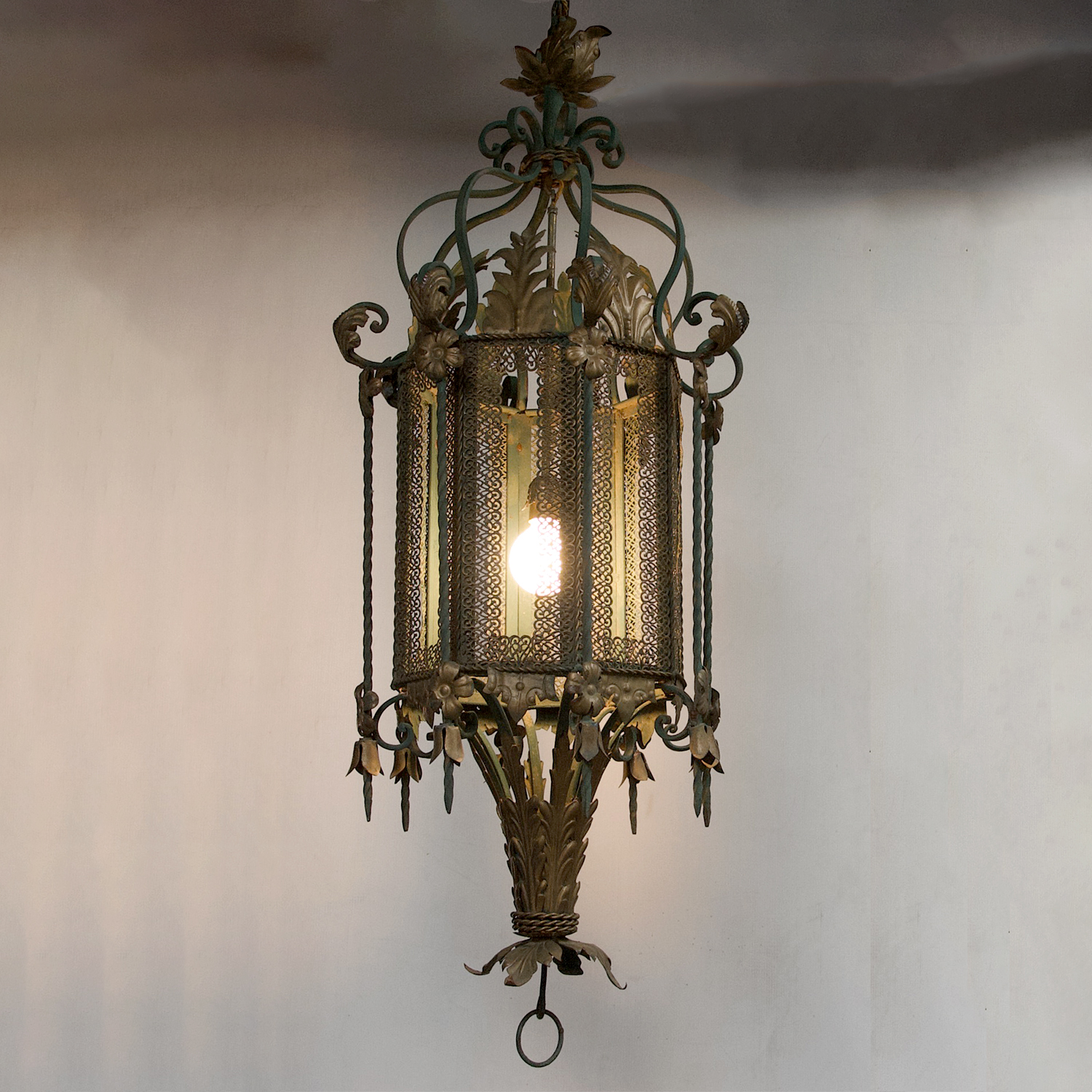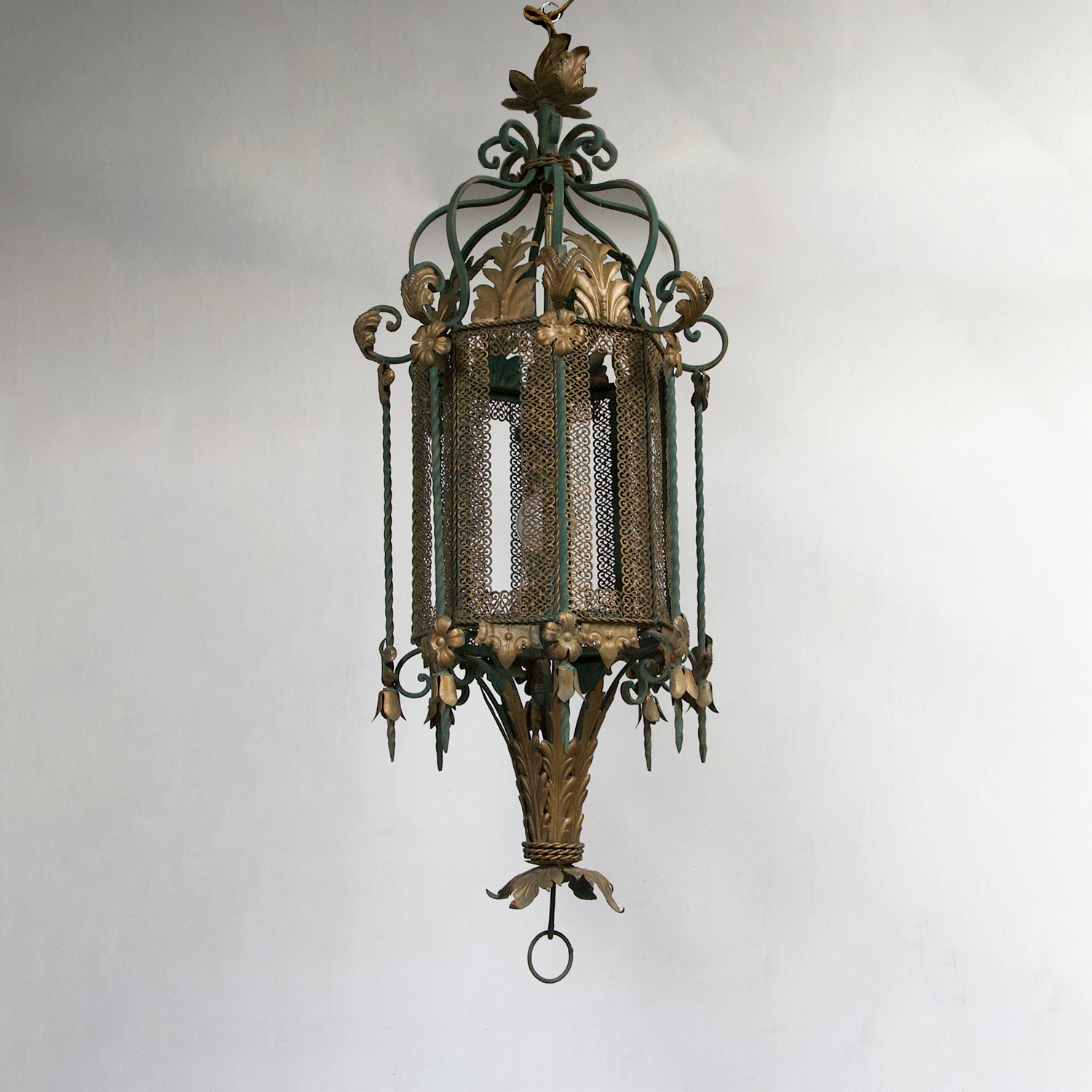 A monumental, rare and decorative, French, wrought iron lantern from a chateau. This fabulous lantern once hung in the vestibule of a French chateau - intricately crafted in wrought and perforated iron, original painted and gilt finish. The lantern dates from the late 19th / early 20th century. A stunning feature light for a modern home or commercial space.