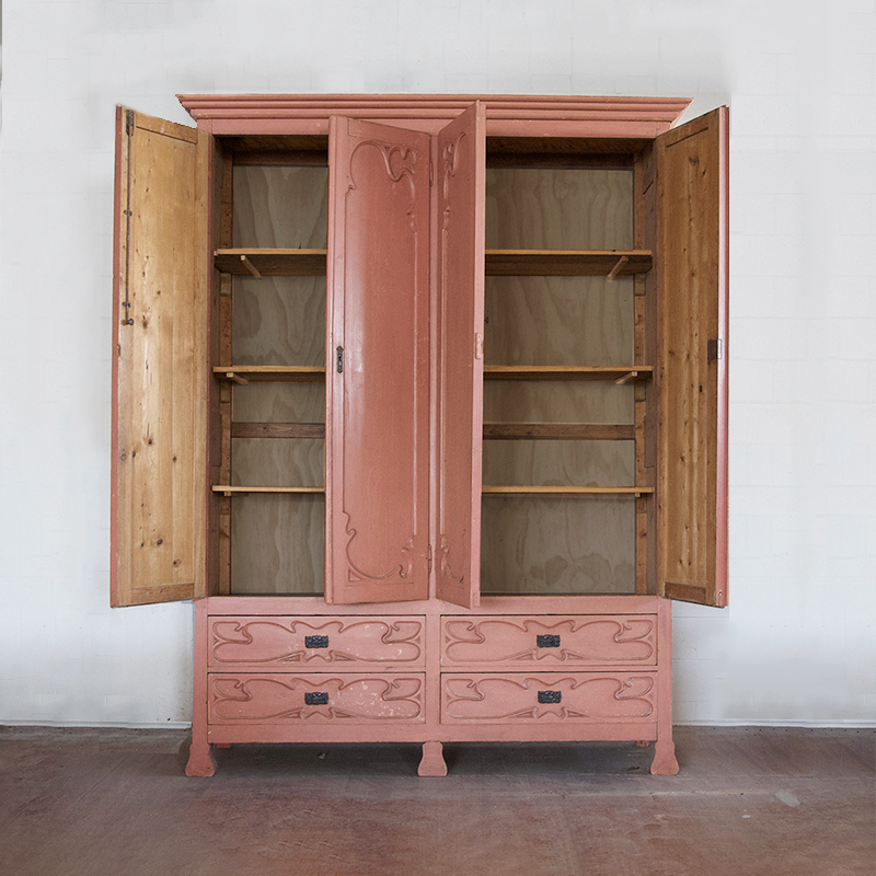 An exceptional, Spanish, housekeeper's cupboard from the Art Nouveau period circa 1890. This astonishing cupboard hails from a convent in Northern Spain and would have been used to store housekeeping elements such as linen. It is a spectacular feature piece with its monumental proportions and original, faded, rose pink painted finish. Oozing Spanish alegria de vivir this beautiful cupboard is whimsical, joyful and the most practical storage solution for a large space that I have ever seen. Rare and inimitable - a truly magnificent piece.