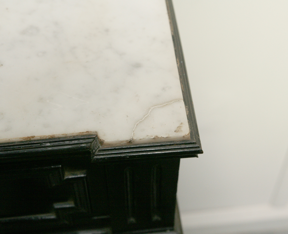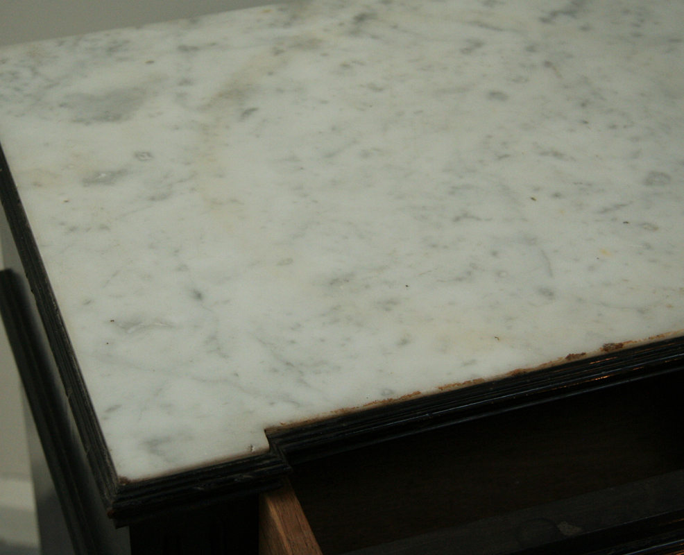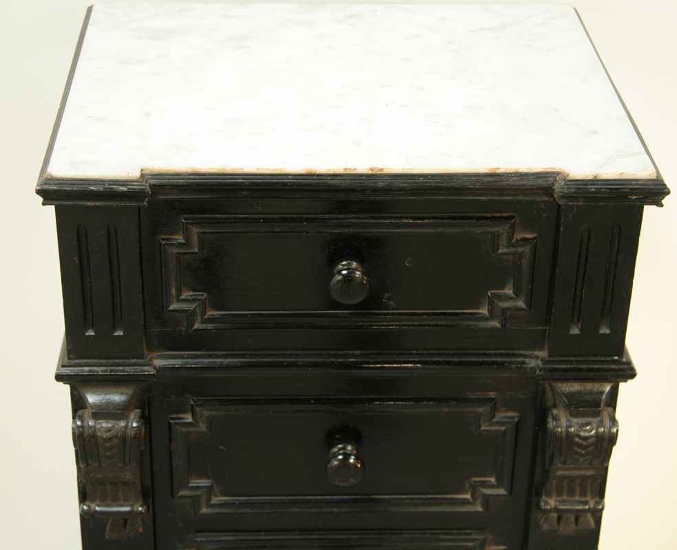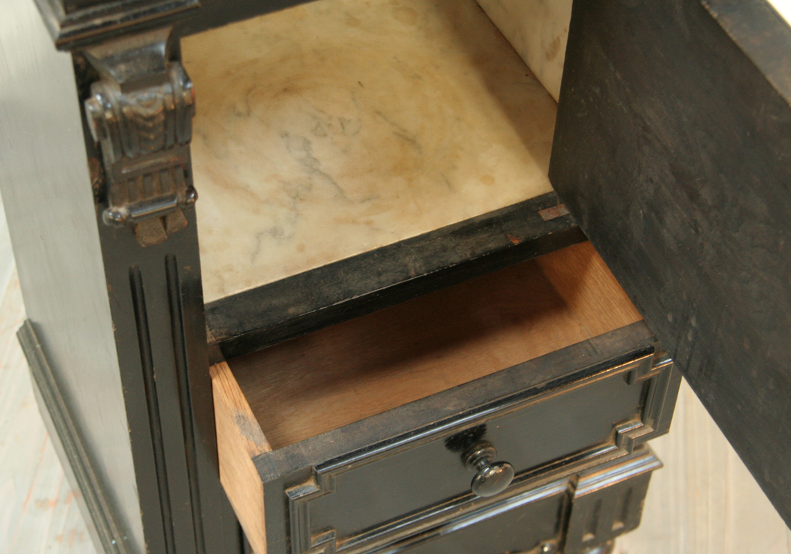 A stylish little late 19th century French Napoleon III period bathroom cabinet with marble lined cupboard. The ebonised finish is original and adds a gothic appeal to the cabinet. The perfect little cabinet to add glamour to your bathroom or bedroom.