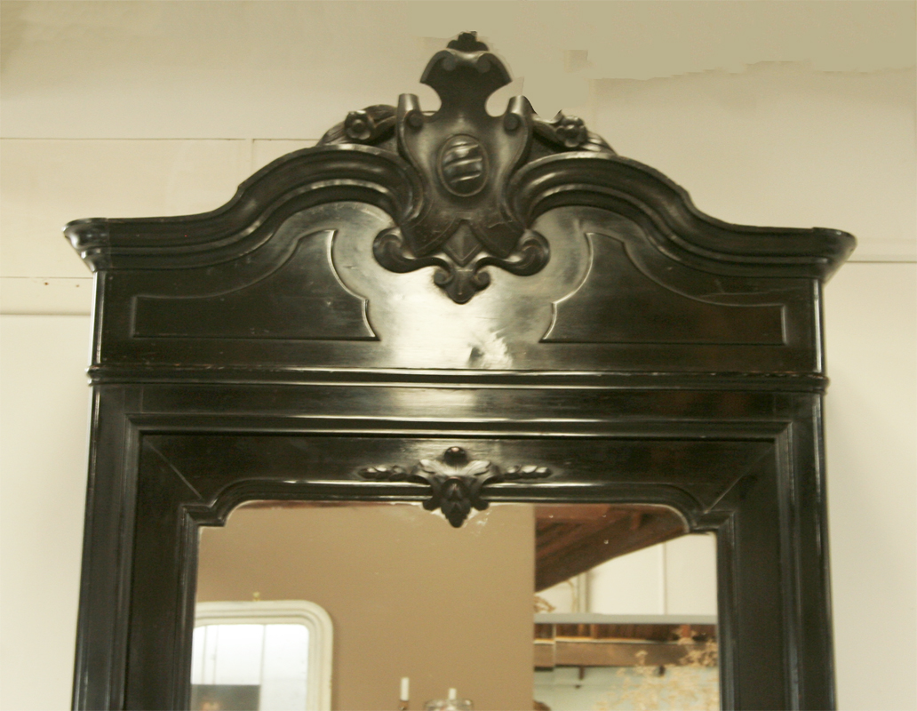 An elegant French 19th century bonnetière. This single door armoire dates from the Napoleon III period , circa 1880. The chic ebonised finish is original as is the mirrored glass. The style is pure Louis 15 th - the beautifully carved serpentine curves of the pediment are an attractive decorative flourish. The interior is fitted with several drawers and a hidden drawer is secreted in the base. This armoire would easily lend itself to having clear glass mounted in the door if the preferred usage was to house a treasured collection for view.