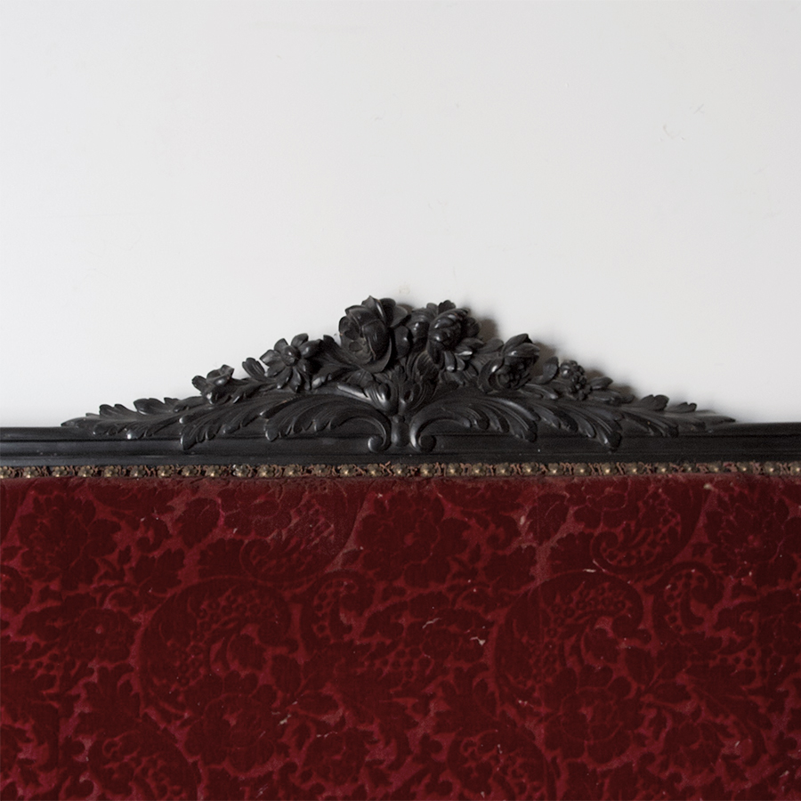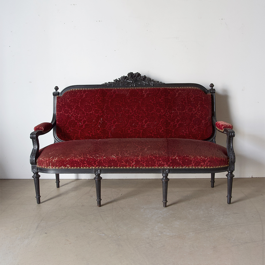 A beautifully decorative, late 19th century, Napoleon III period, Louis 16 style settee. Original ebonised finish, exquisite quality carving and original deep red velvet brocade upholstery. A stunning settee for an entranceway or bedroom perhaps.