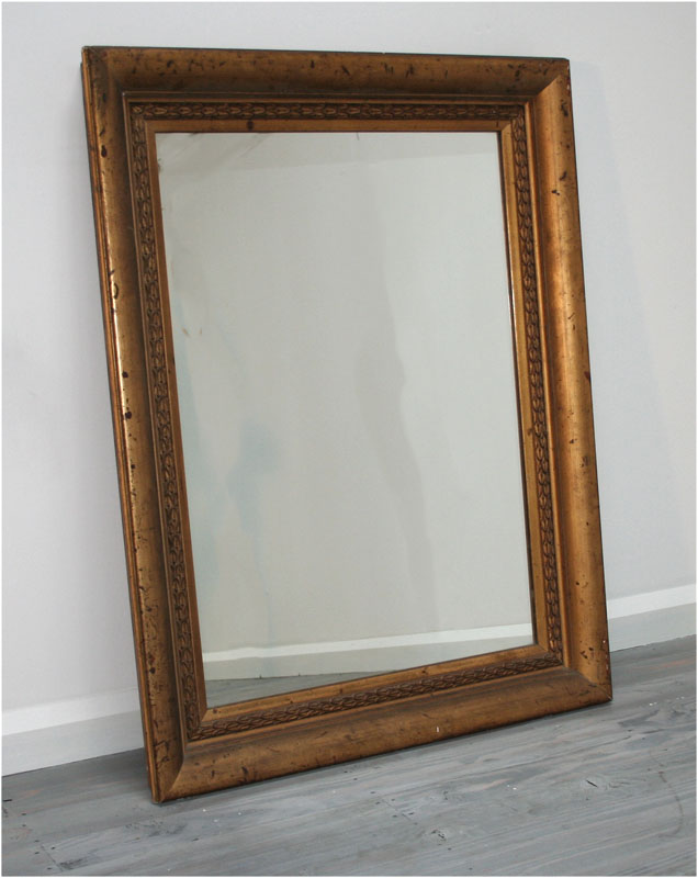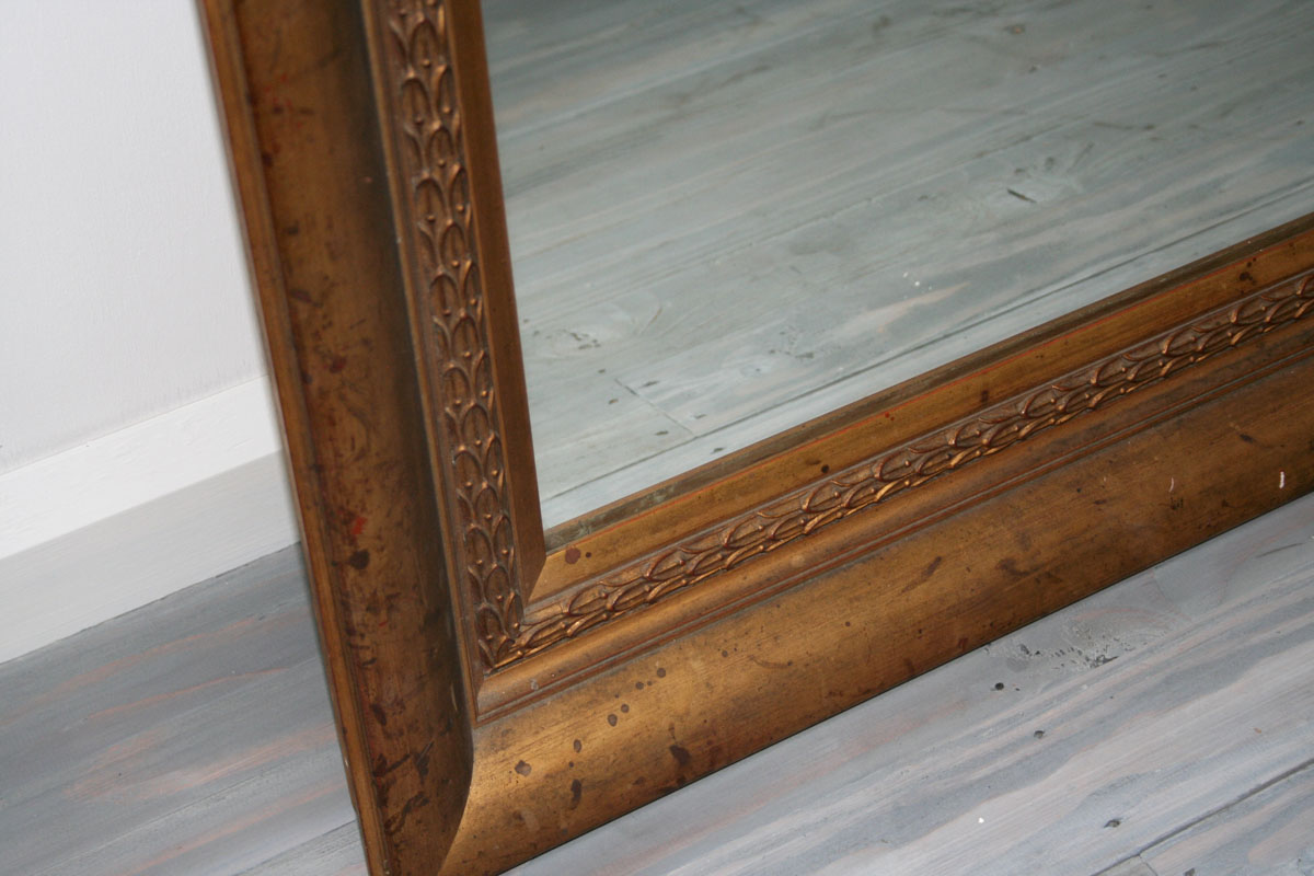 A turn of the century, circa 1900, French gilt mirror in the neoclassical style. Restrained decoration with a freize of olive leaves bordering the mirror. New glass and backing.