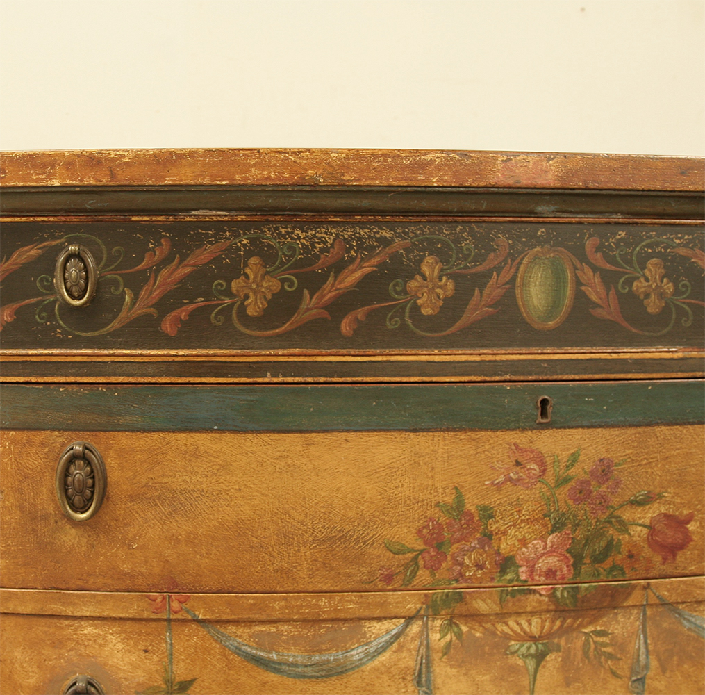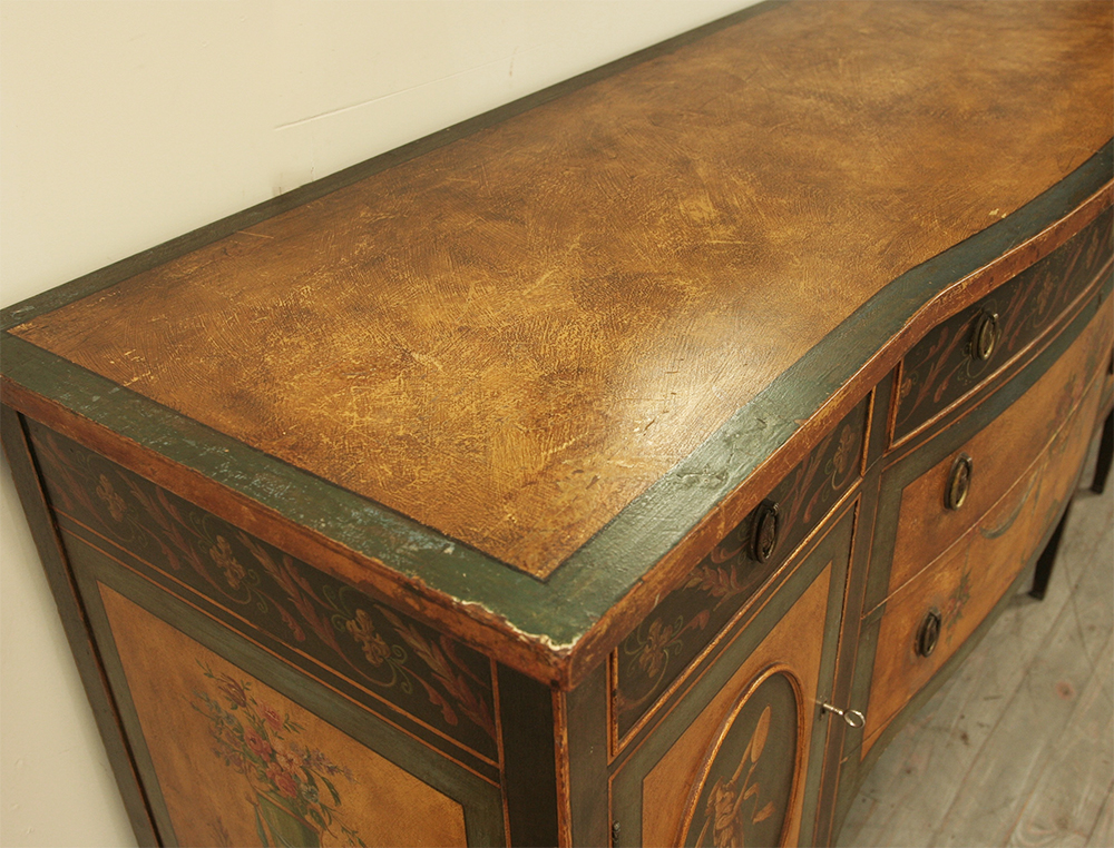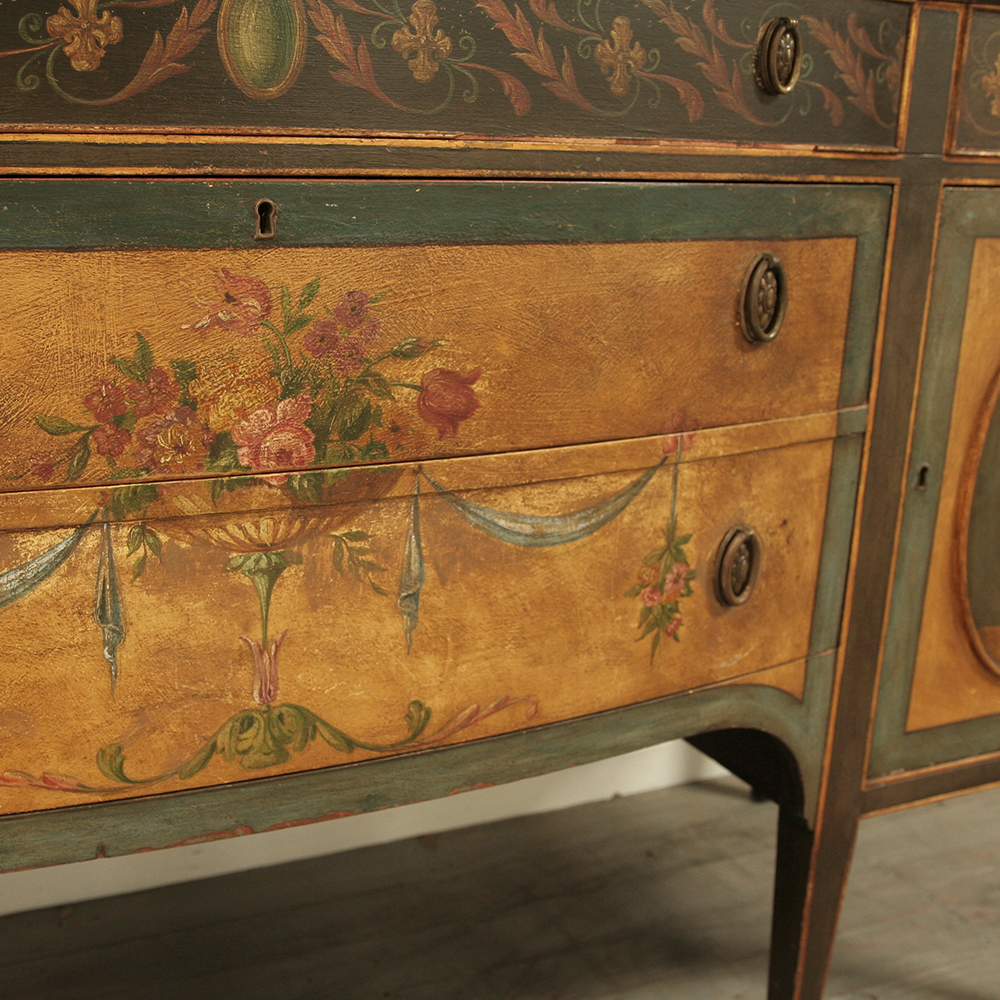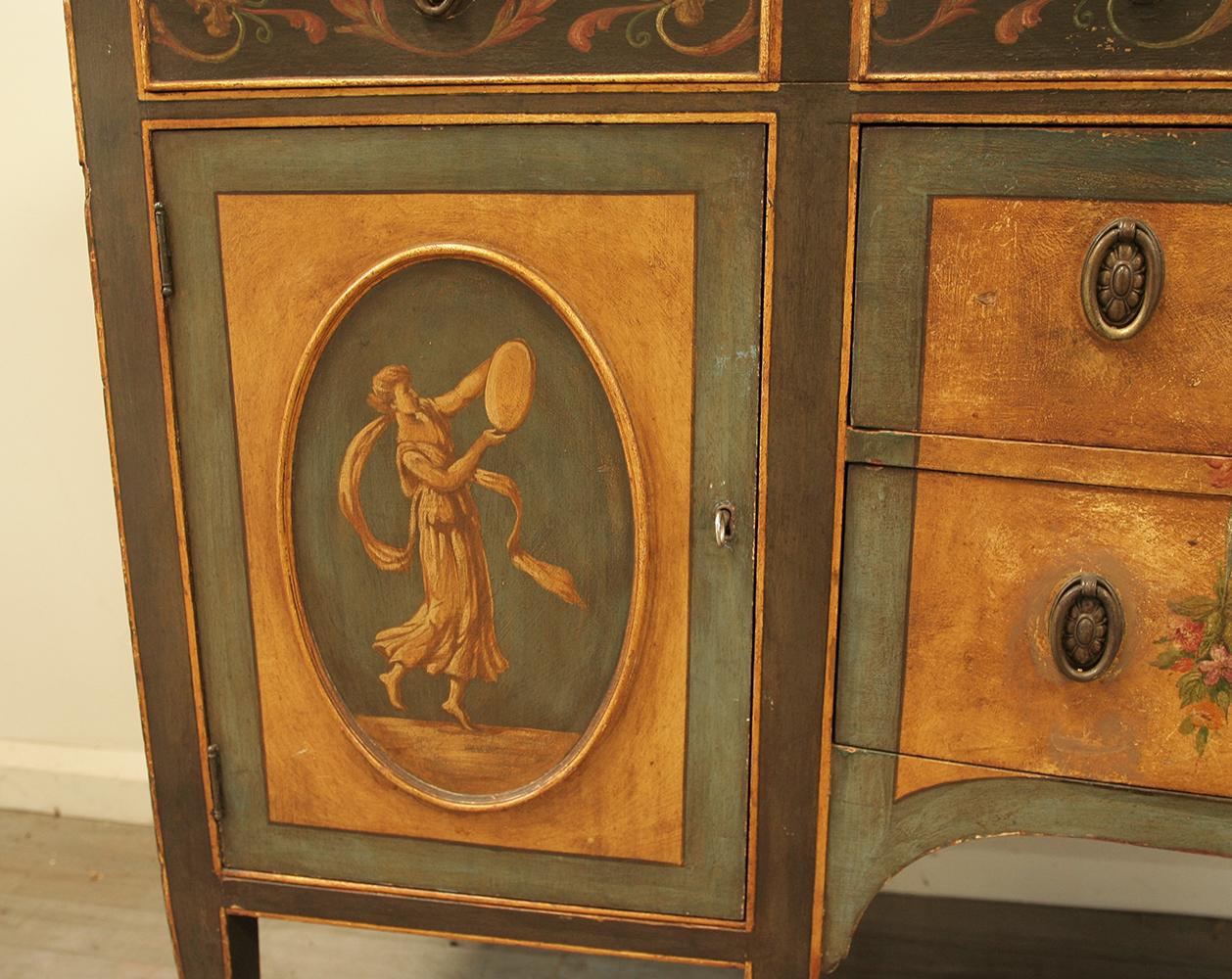 An exceptional 1920's Robert Adam revival sideboard. Beautifully crafted with original hand painted decoration in a gorgeous colour palette plucked from classical antiquity. A beautiful Neoclassical feature piece for a discerning interior.