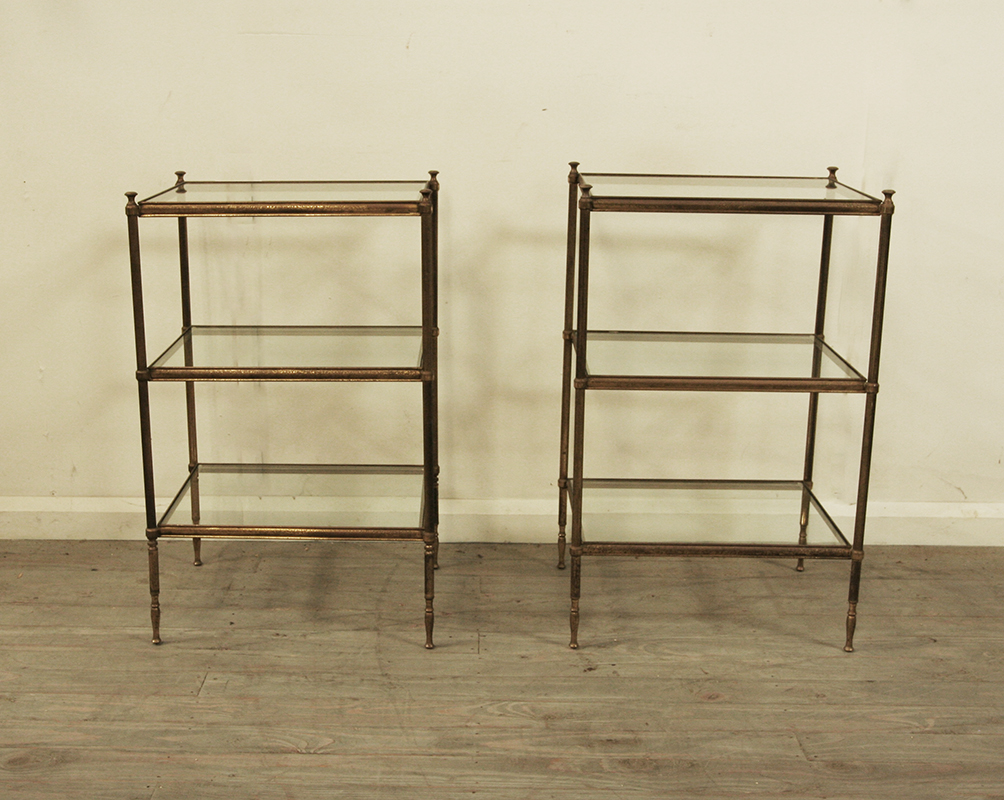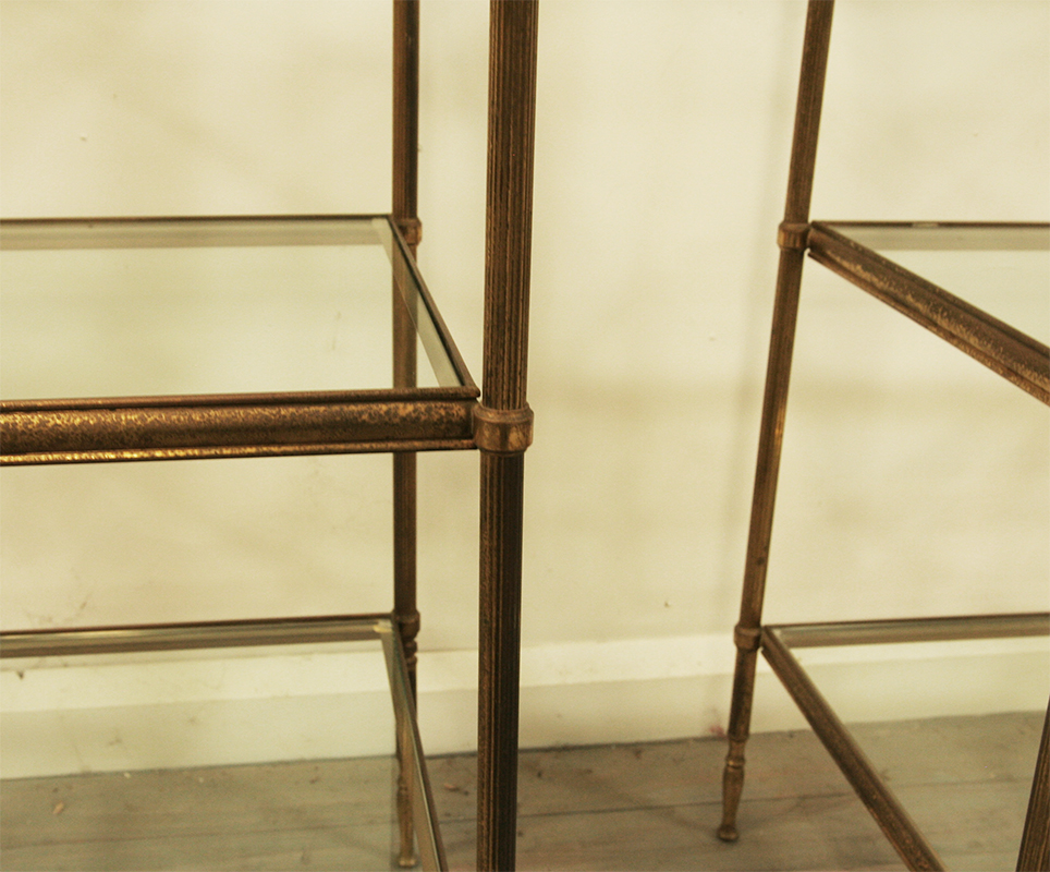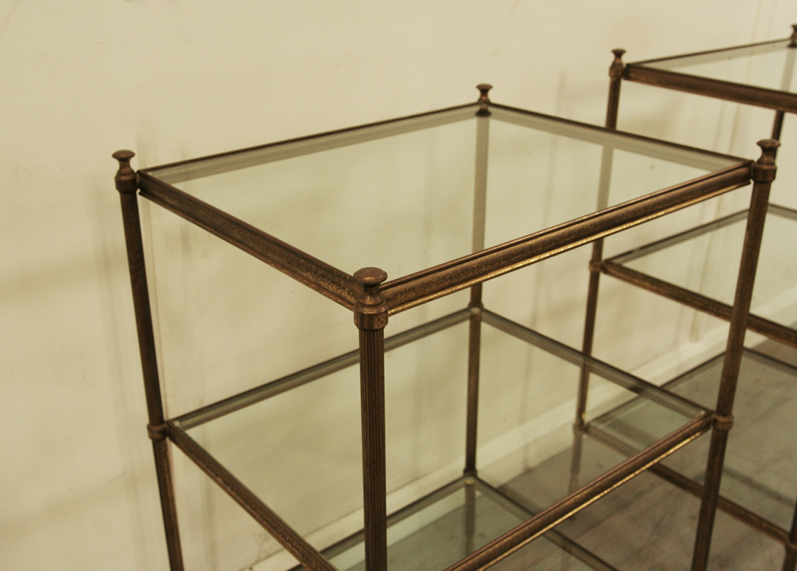 A stylish pair of 1940's tiered tables with reeded legs and glass shelves. The metal frames are brass plated and patinated by time. They are a harlequin pair as one table is fractionally taller than the other. Priced as a pair but may be sold separately.