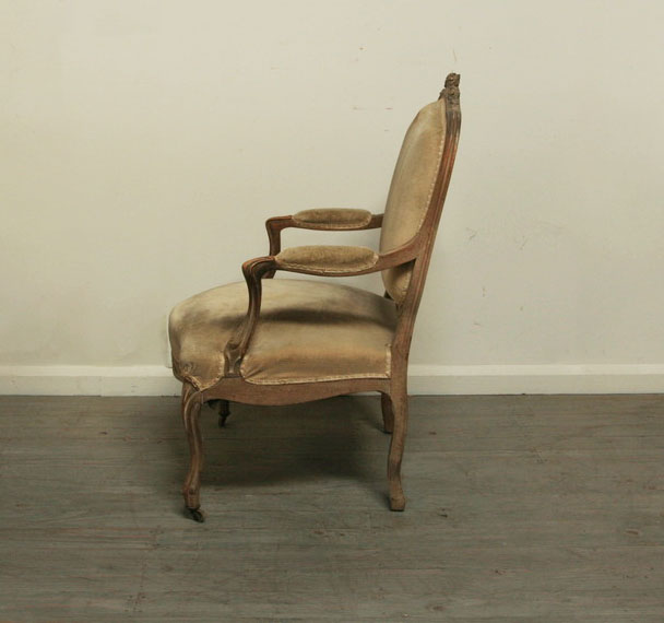 A charming pair of late 19th century French blonded beech Louis 15 style fauteuils. This lovely pair of chairs have their original putty coloured velvet upholstery which is time worn yet charming. Reupholster or just enjoy the decorative authenticity of the original fabric.