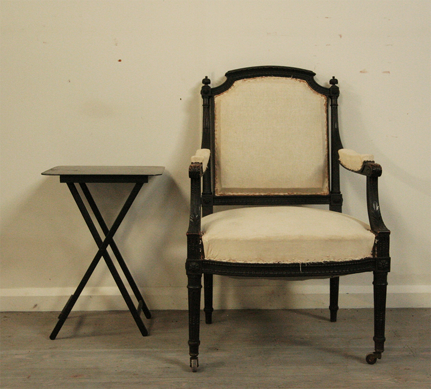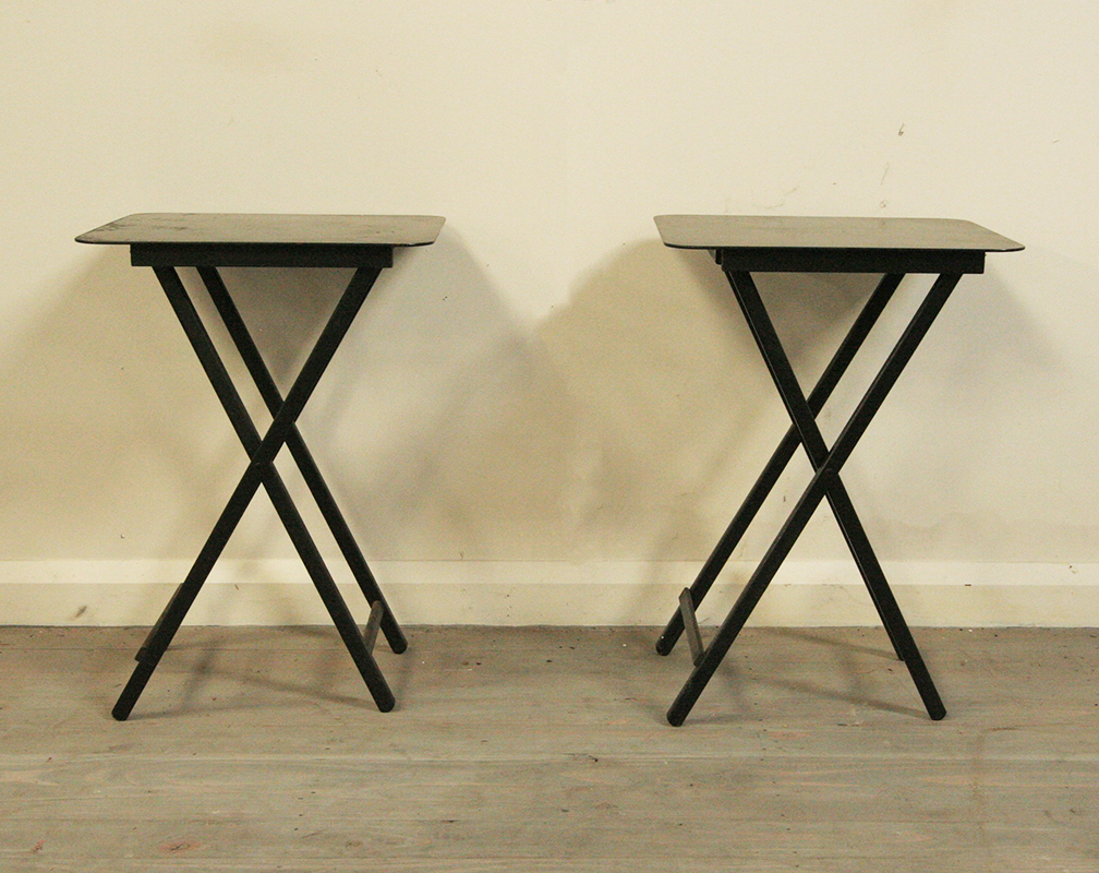 A sweet little pair of American ebonised sidetables. Faint traces of eagle emblems visible on the top. A smart solution for occasional tables in a living room setting or an interesting alternative for bedside tables. These tables fold, are lightweight and are extremely portable !