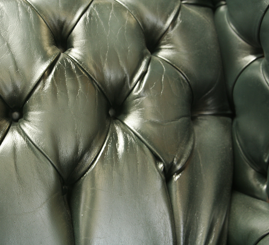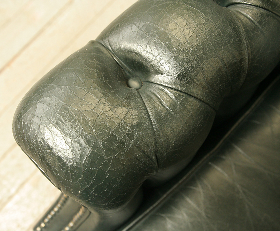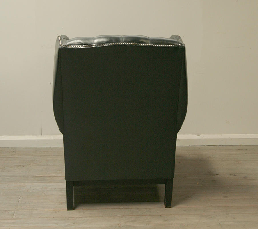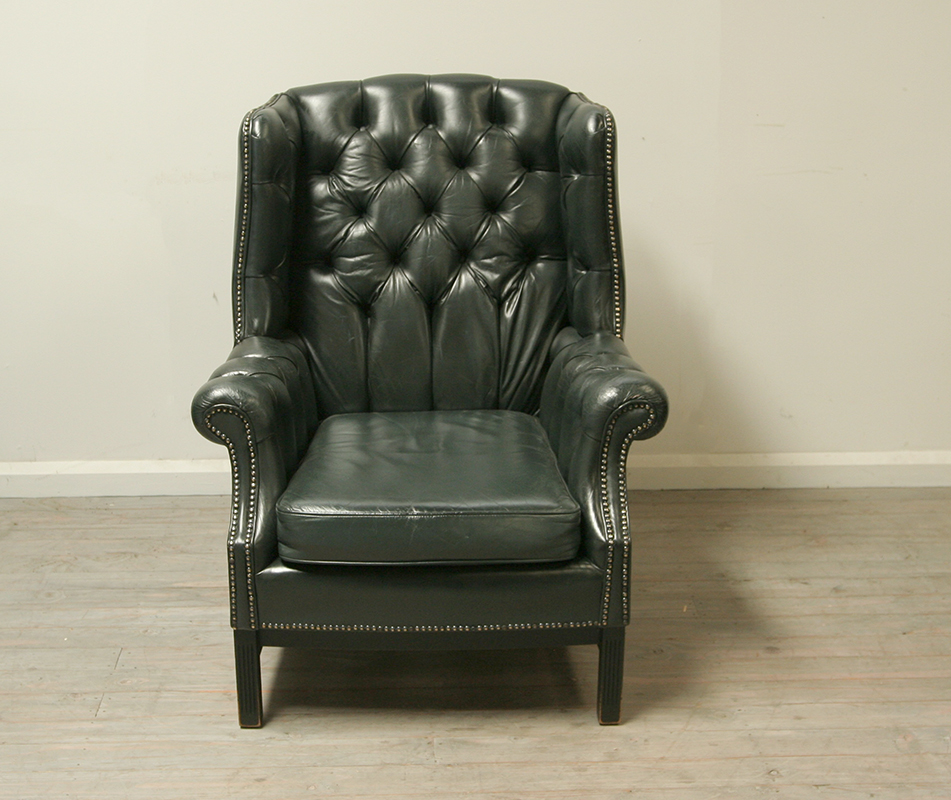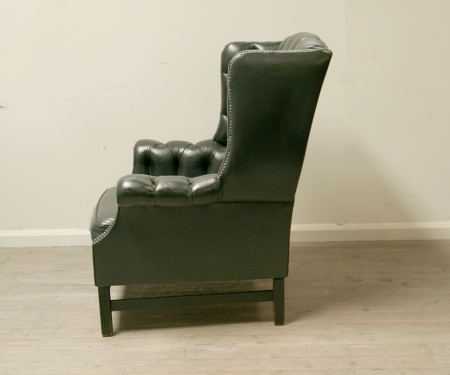 A smart pair of 1970's leather, deep buttoned, wing chairs in the Georgian style. Classical proportions and lines - the leather has been refinished in a very stylish dark licorice green. A great pair of chairs for a modern study, library or office or beautiful statement chairs for a large living room. Priced as a pair.