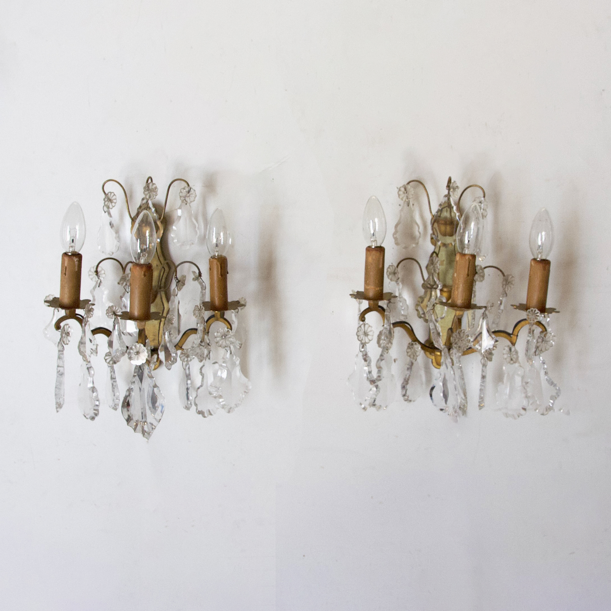A pair of French, early 20th century, brass and crystal sconces in the Baroque style. Lovely dimensions and brimming with crystals - these would add a decorative, French, lighting flourish to any room. Priced as a pair.