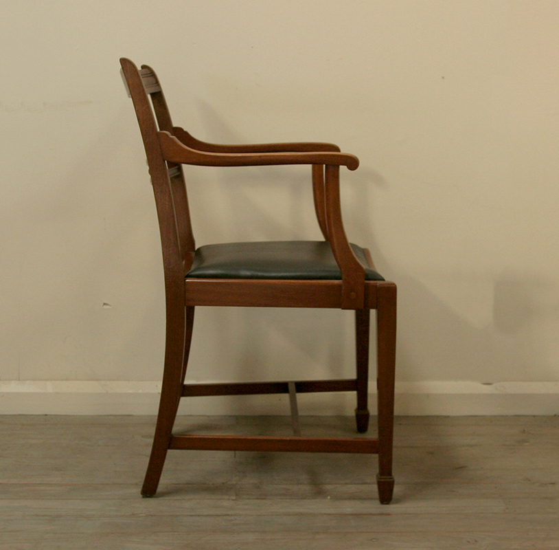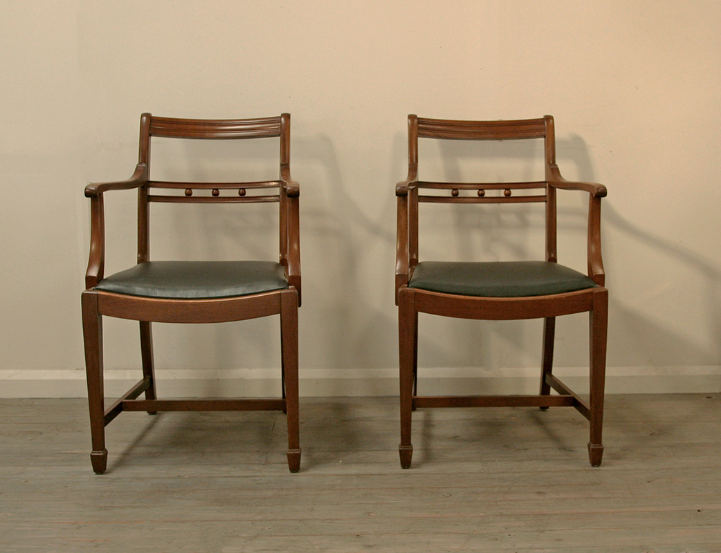 A pair of mid century, neoclassical armchairs in the Georgian style. Mahogany and newly upholstered black leather seats. This stylish pair of chairs are superbly comfortable - they could be used as carver chairs at the end of a dining table, great desk chairs or simply as smart side chairs for a hallway or entrance way. They are tasteful and timeless - very House Of Cards ! Priced as a pair.